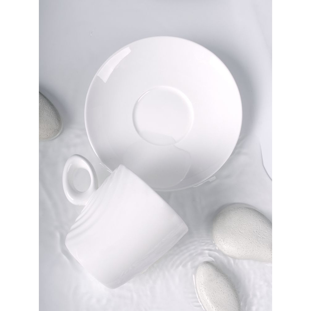 Форма сервиза создана в скульптурной технике: фарфор словно запечатлел сам момент движения. Необычная ручка предметов символизирует камень, от которого появляются завораживающие круги на воде — корпусе изделия.