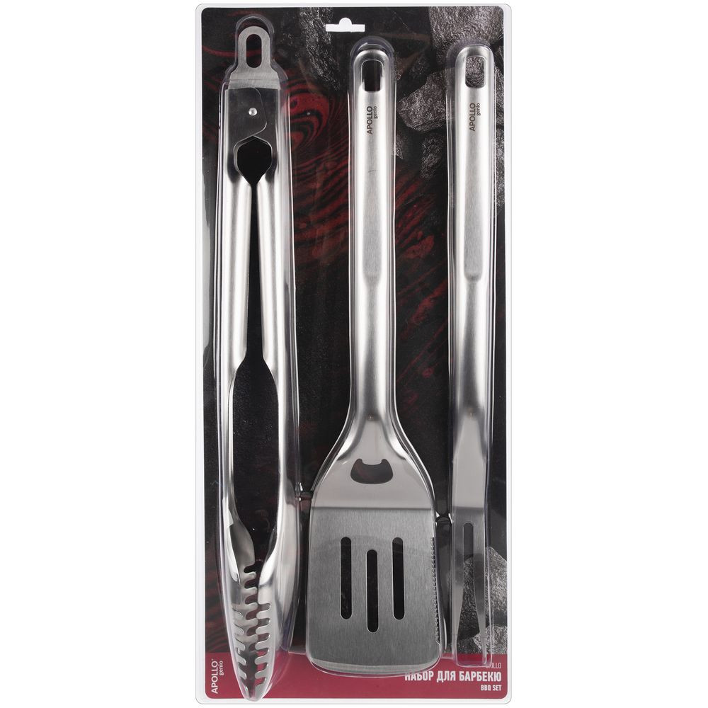 В набор входят: щипцы, вилка и лопатка.