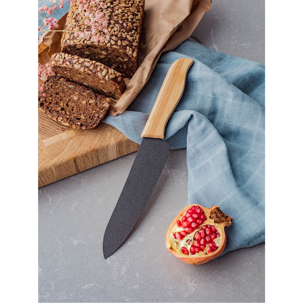 Нож Selva выполнен из керамики и бамбука. Широкий клинок имеет оптимальную форму и режущую кромку, которая не нуждается в заточке. Удобная анатомическая ручка ножа надежно лежит в руке, не скользит, практически не впитывает влагу.