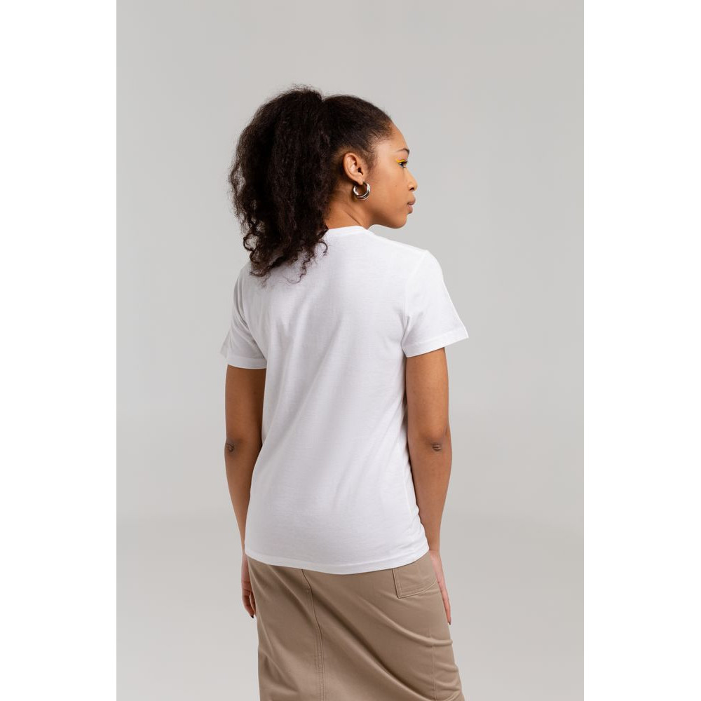 Женская футболка с уплотненными швами на плечах и двойным швом с эластаном. Четырехслойная резинка на воротнике предохраняет его от растяжения.