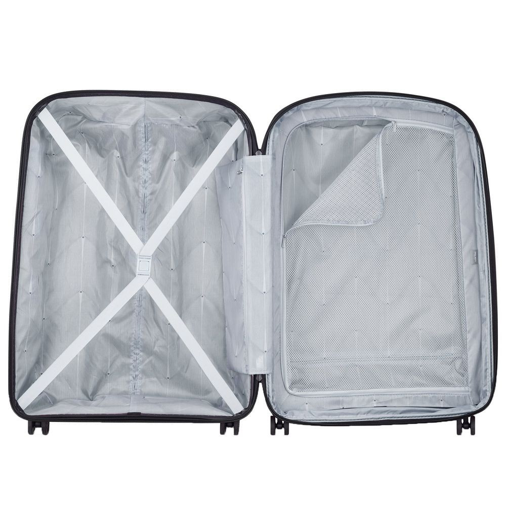 - Чемодан с 2 отделениями: одно из них с фиксирующими ремнями и карманом-органайзером на молнии, второе — с разделителем