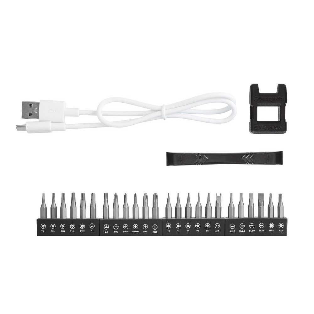Электрическая отвертка в металлическом корпусе с магнитным патроном. Работает от аккумулятора емкостью 350 мАч, который полностью заряжается через кабель USB примерно за 70 минут. На корпусе есть светодиодный индикатор зарядки. Отвертка комплектуется 24 битами, подходящими для ремонта смартфонов, планшетов, ноутбуков и ПК, включая iPhone, iPad, MacBook Air и MacBook Pro, а также игровых консолей и контроллеров от Nintendo, PlayStation или XBox.