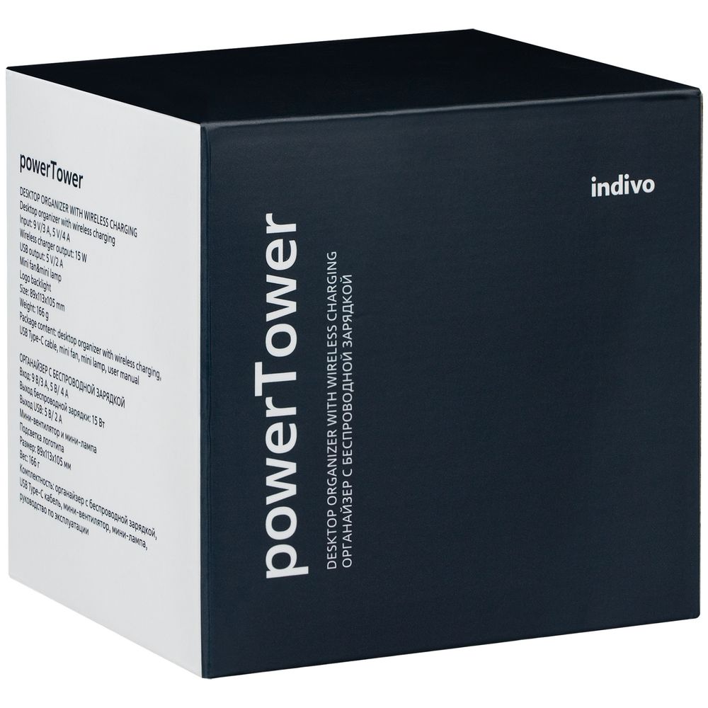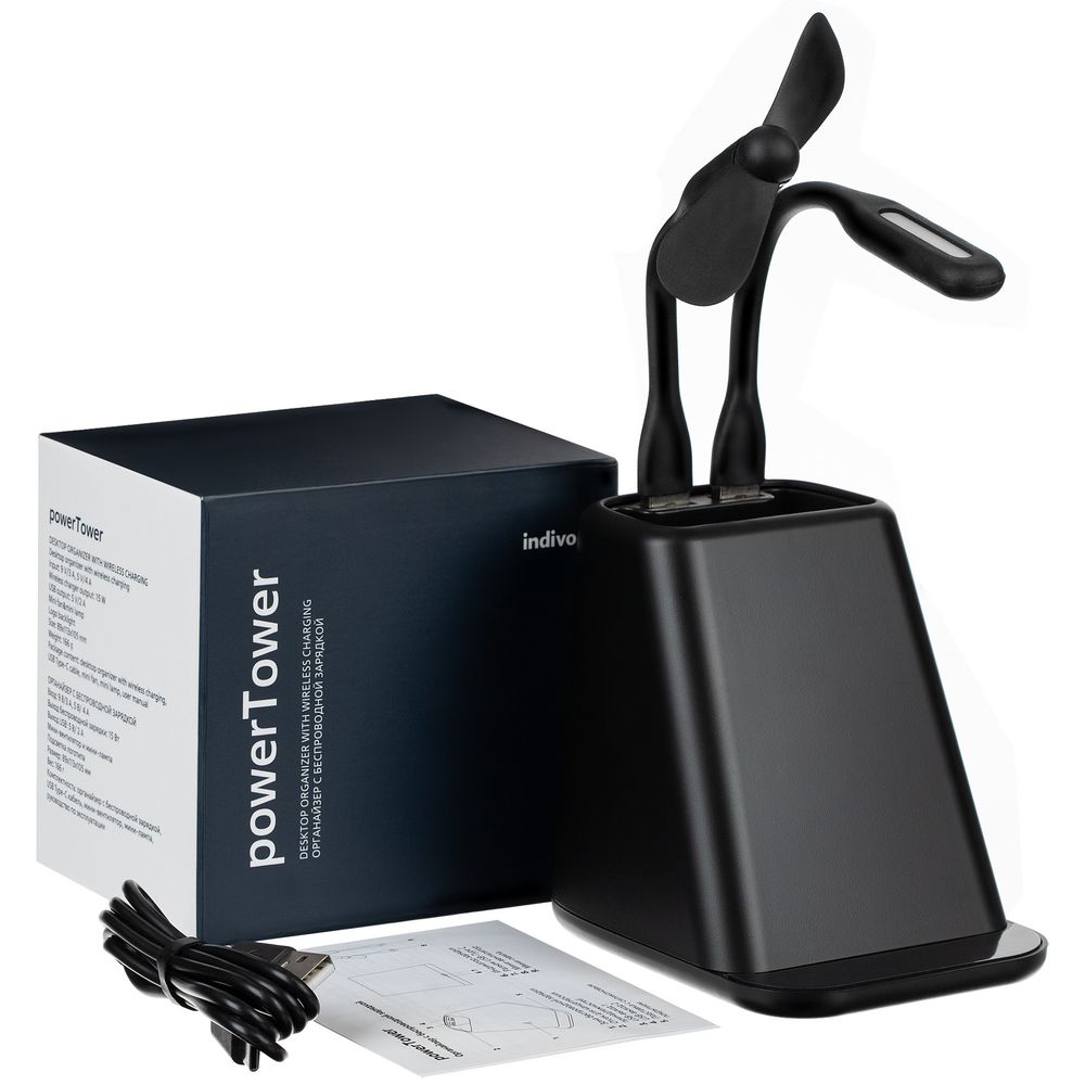 Настольный органайзер с зарядкой, лампой, вентилятором и подсветкой логотипа powerTower, черный 1890 ₽