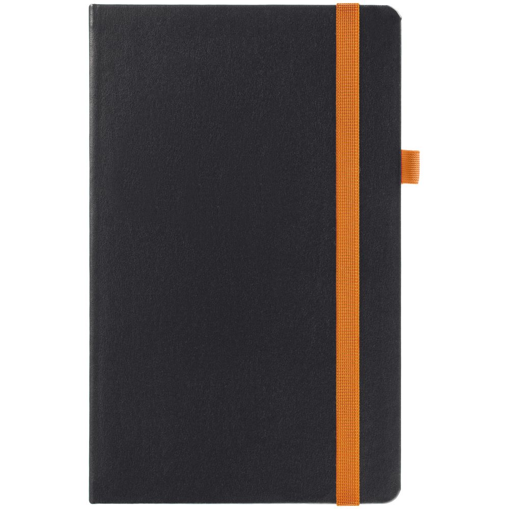 Ежедневник с твердой обложкой, выполнен из материала Waltz, черный АА, дополнен оранжевой резинкой и ляссе.