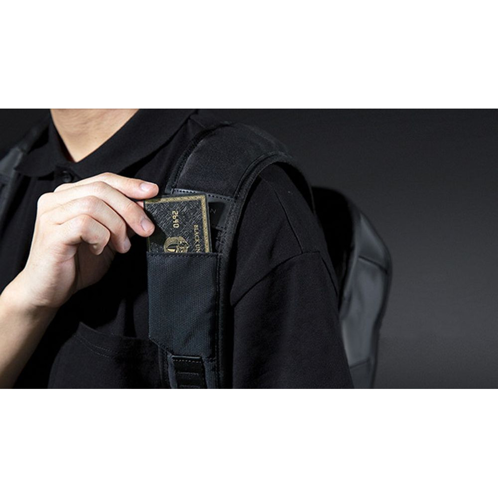- Дополнительно на лямках расположен карман с RFID-защитой для кредитной карточки и петельки, за которые можно прицепить очки или проводные наушники