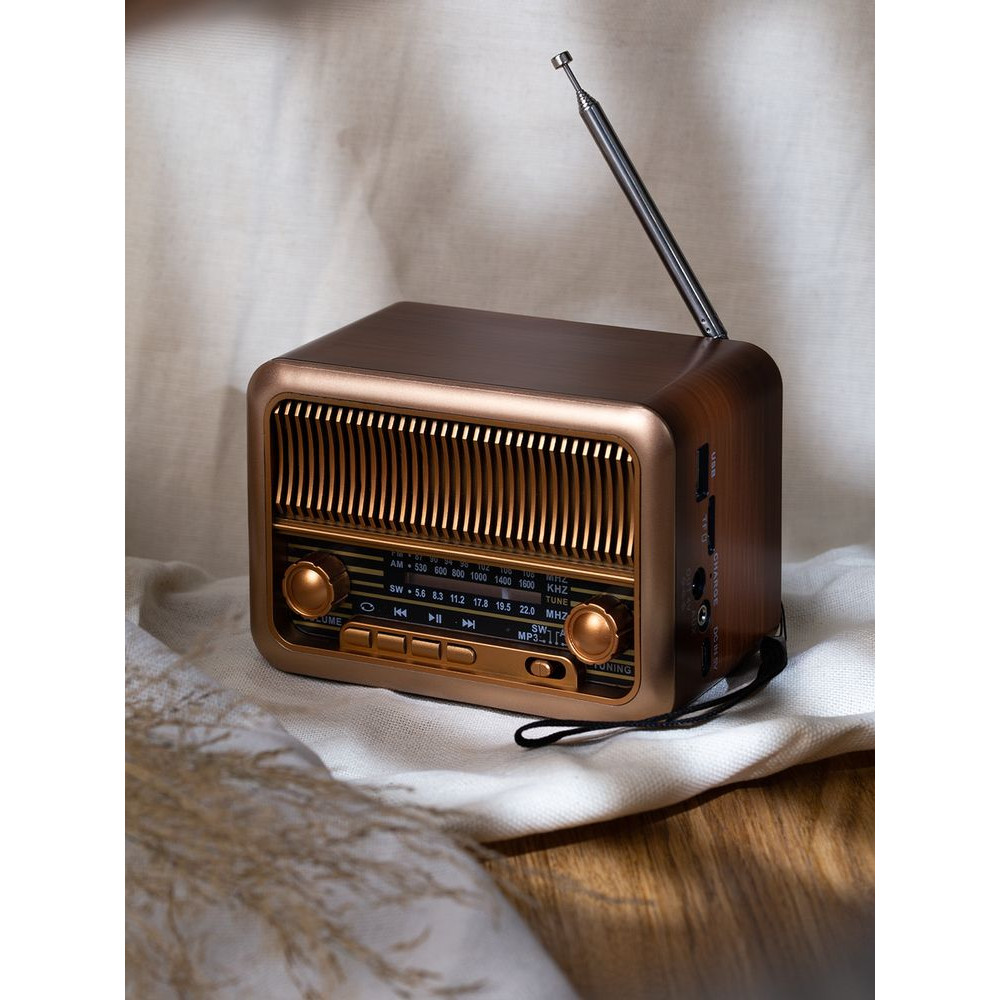 За корпусом, всем своим видом отсылающим к актуальному стилю мидсенчури, скрываются вполне современные функции: возможность воспроизведения музыки по Bluetooth и с карт памяти различного формата.