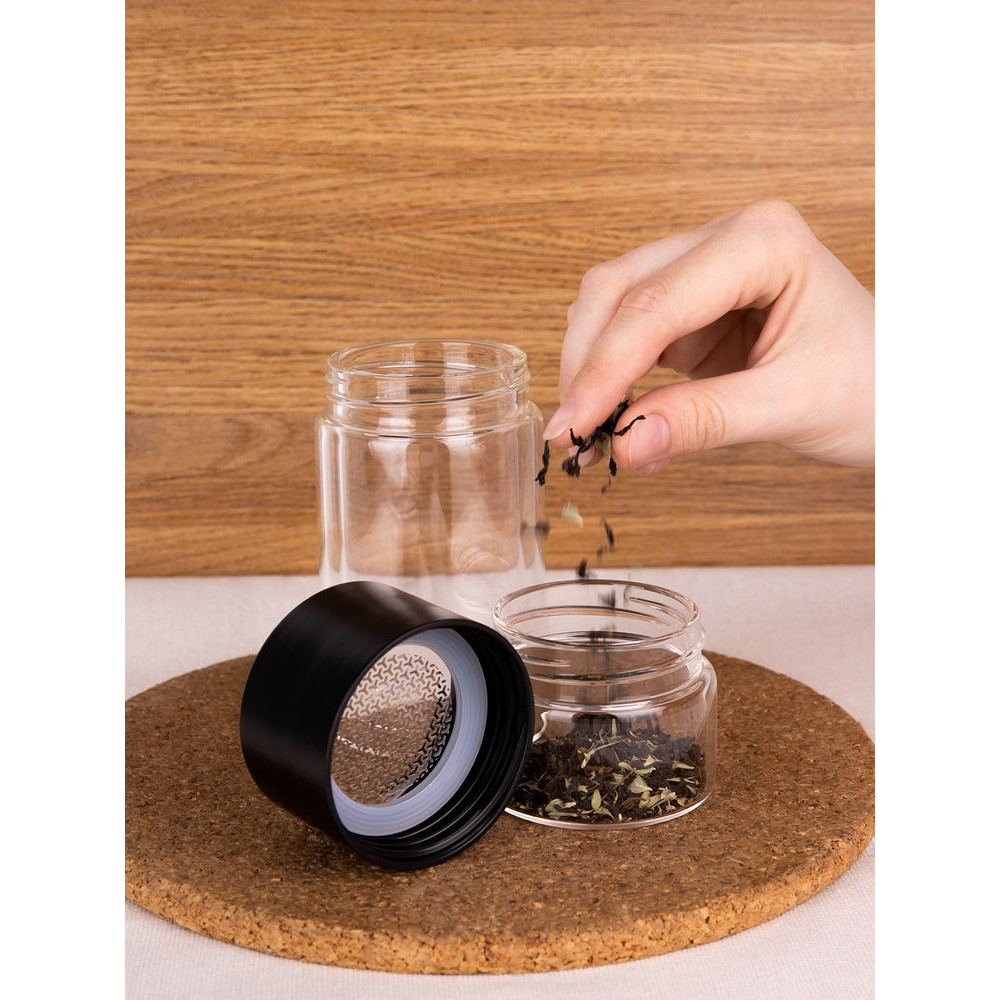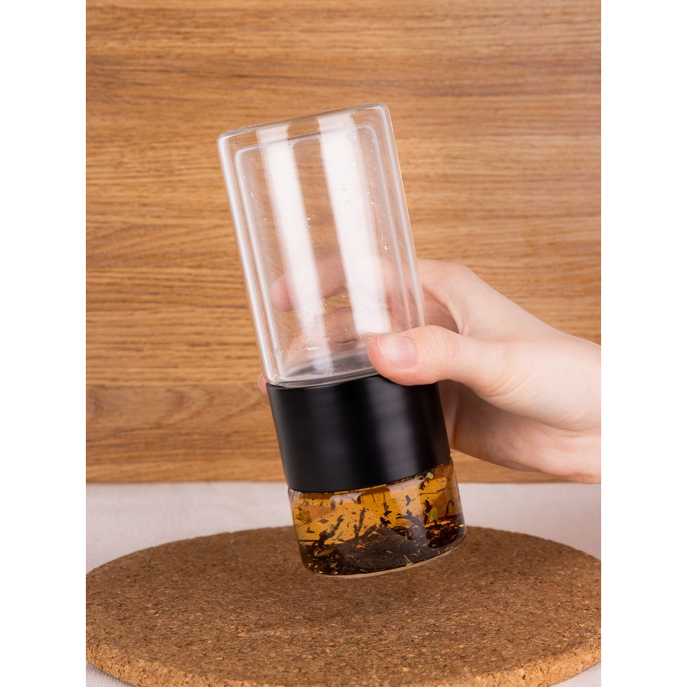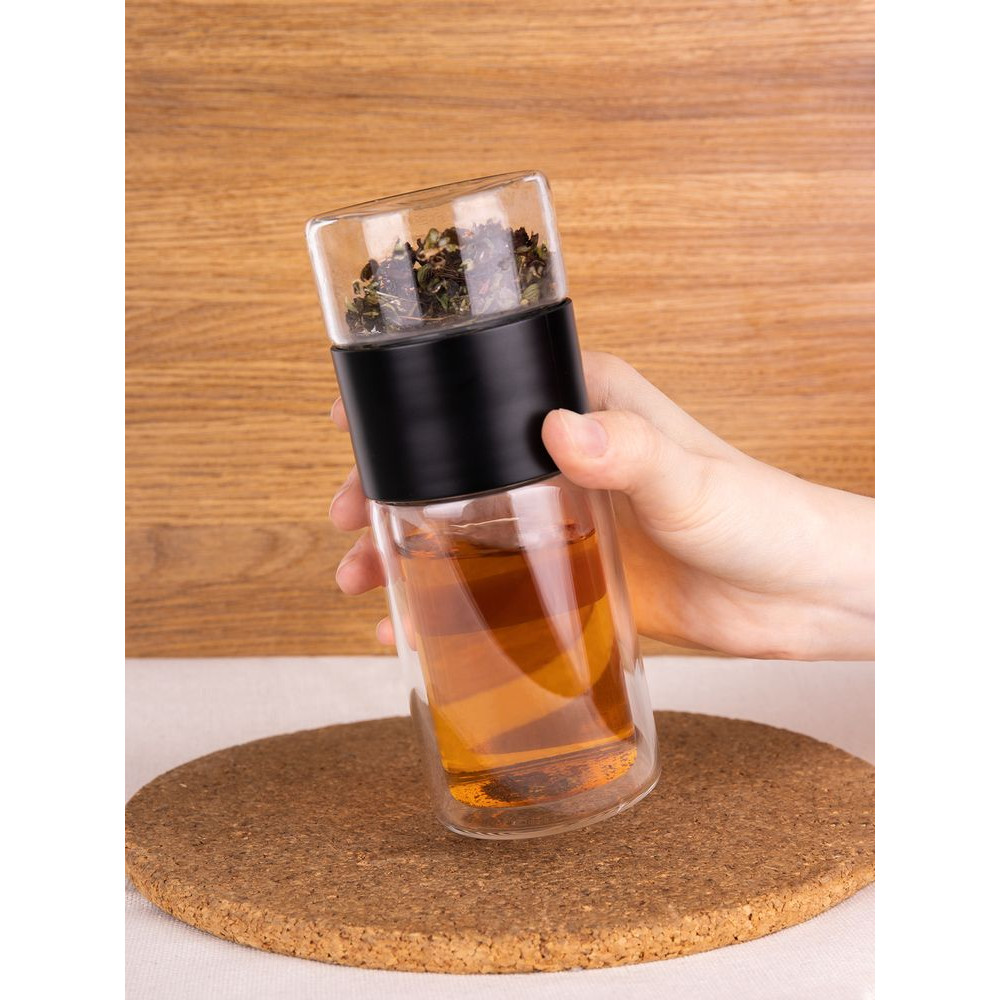Благодаря конструкции с двумя отсеками, разделенными сетчатым фильтром, можно остановить процесс заваривания в любой момент — просто перевернув бутылку. Так настой не получится слишком крепким, а чайный лист получится залить кипятком еще несколько раз, имитируя традиционный способ заваривания проливами. Объема получившегося напитка как раз хватит на стандартную офисную кружку (около 300 мл).