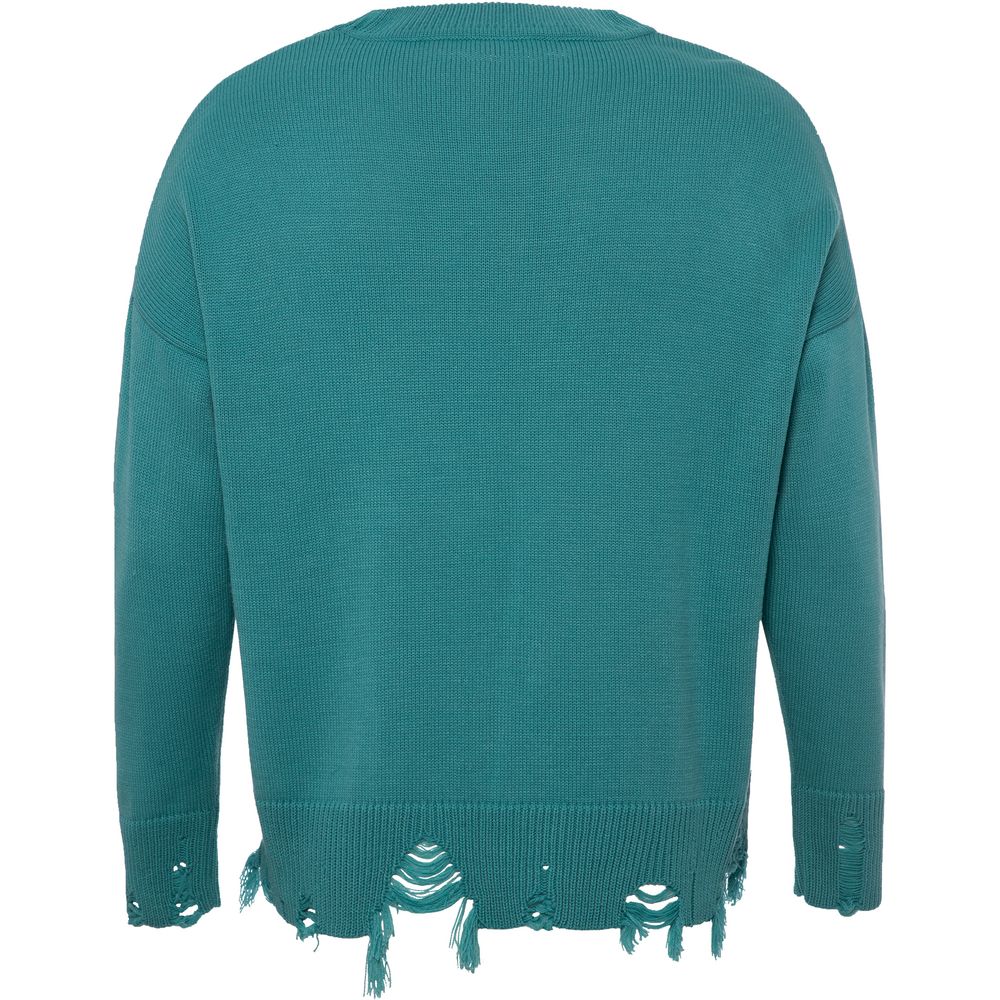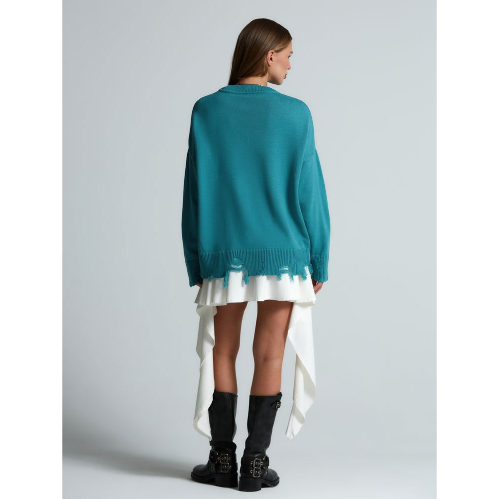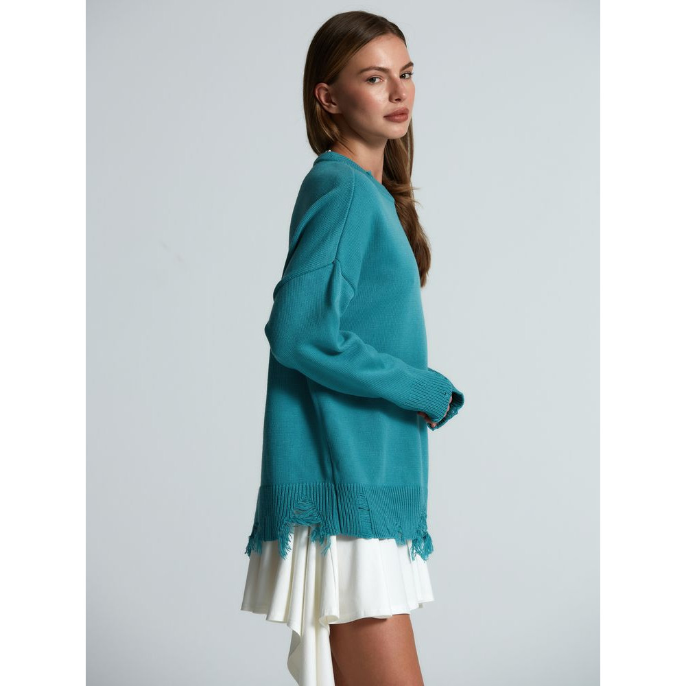Модель: однотонный гладкий свитер унисекс, спущенное плечо. Ворот, манжеты и низ изделия вывязаны резинкой c добавлением эффекта «рваного» края.