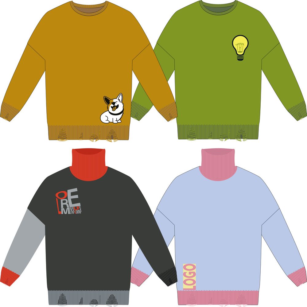 В стоимость входит размещение одного вывязанного логотипа в 2 цвета (без учета основного цвета) площадью до 300 см² на груди или на спинке и возможность выделить другим цветом ворот, манжеты и низ изделия.