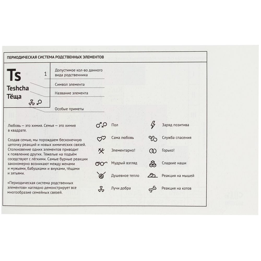 «Периодическая система родственных элементов» наглядно демонстрирует все многообразие семейных связей.Модель без боковых швов, стиль классический, унисекс.