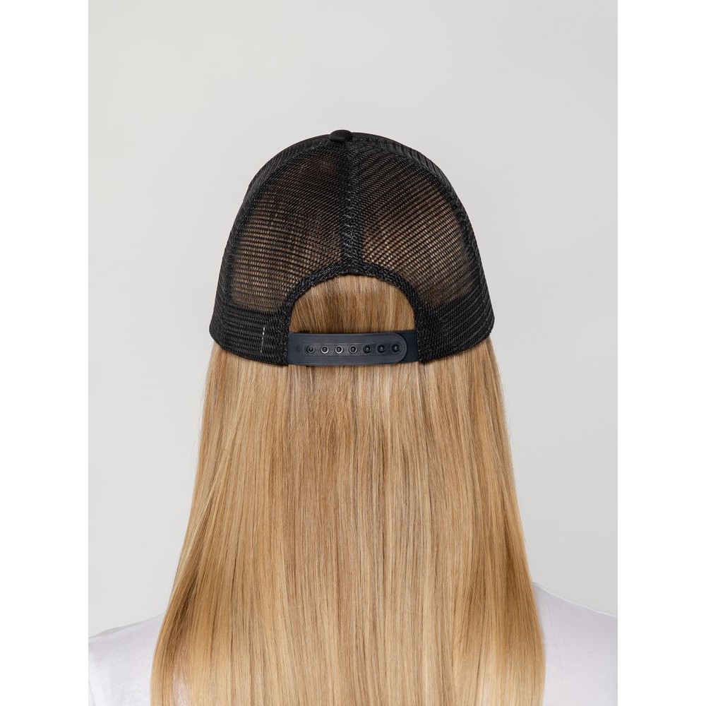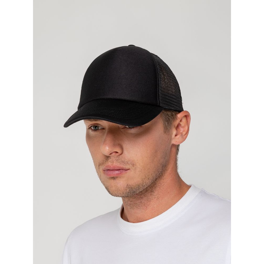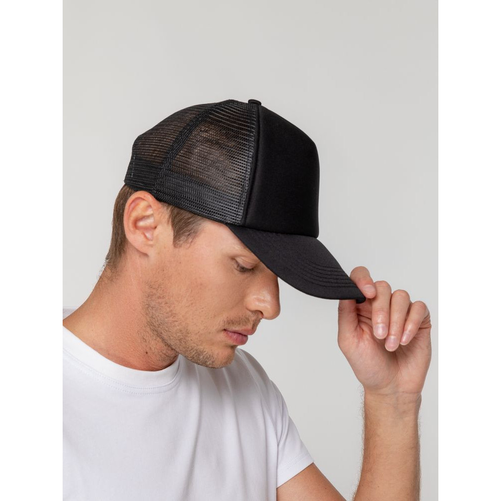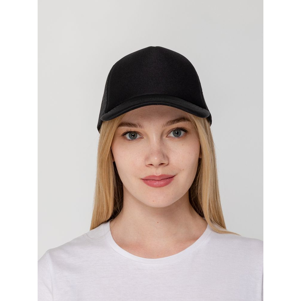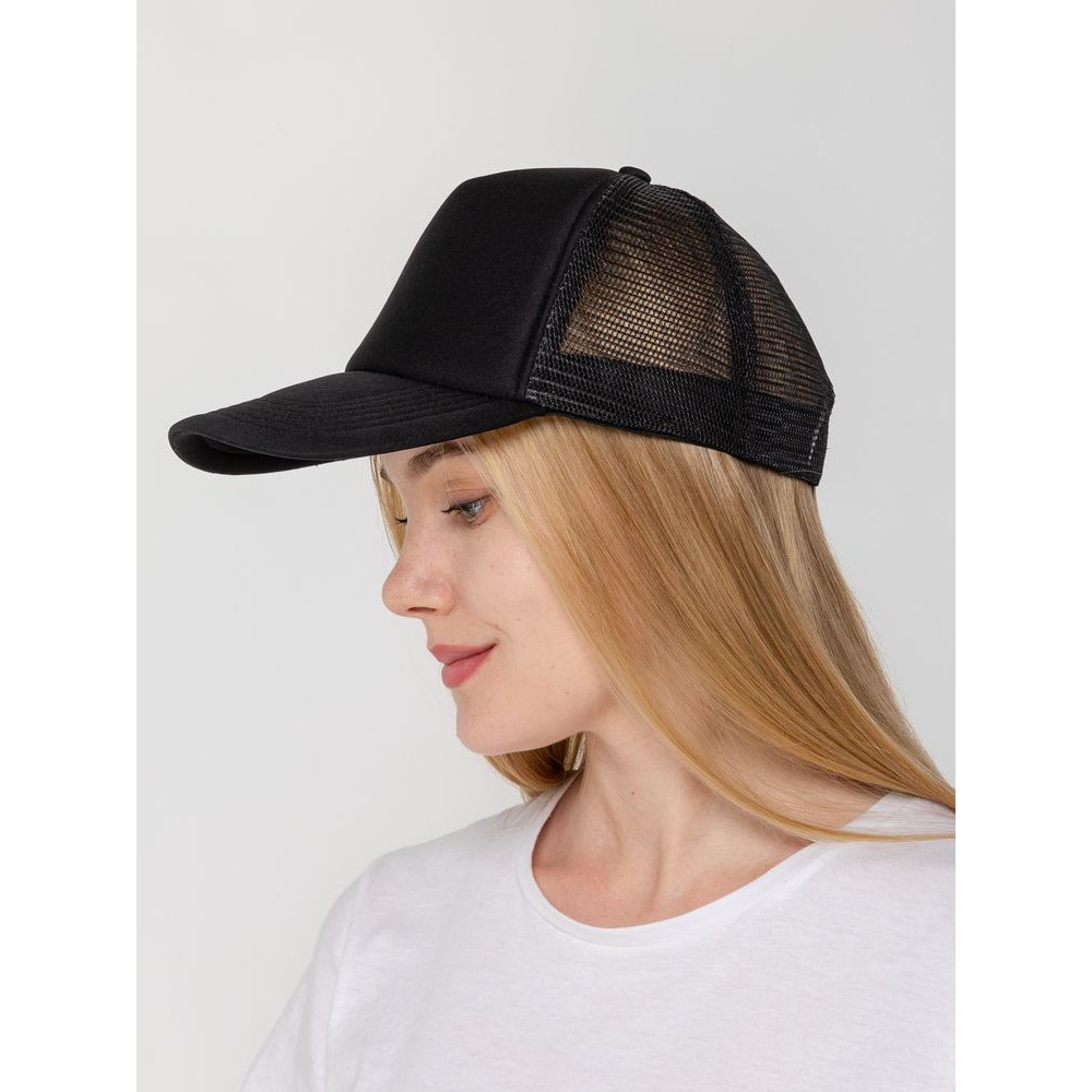 Стандартная модель с 5 клиньями без лобового шва в нестандартном исполнении. Передний клин и козырек выполнены из полиэстера с наполнителем из поролона, боковые и задние клинья — из сетки. Размер регулируется с помощью пластиковой застежки.