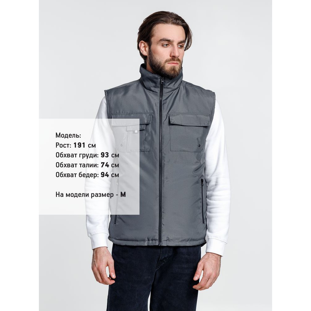 Мужской утепленный жилет с воротником-стойкой и удлиненной спинкой. Выполнен из ткани оксфорд с водоотталкивающим покрытием.