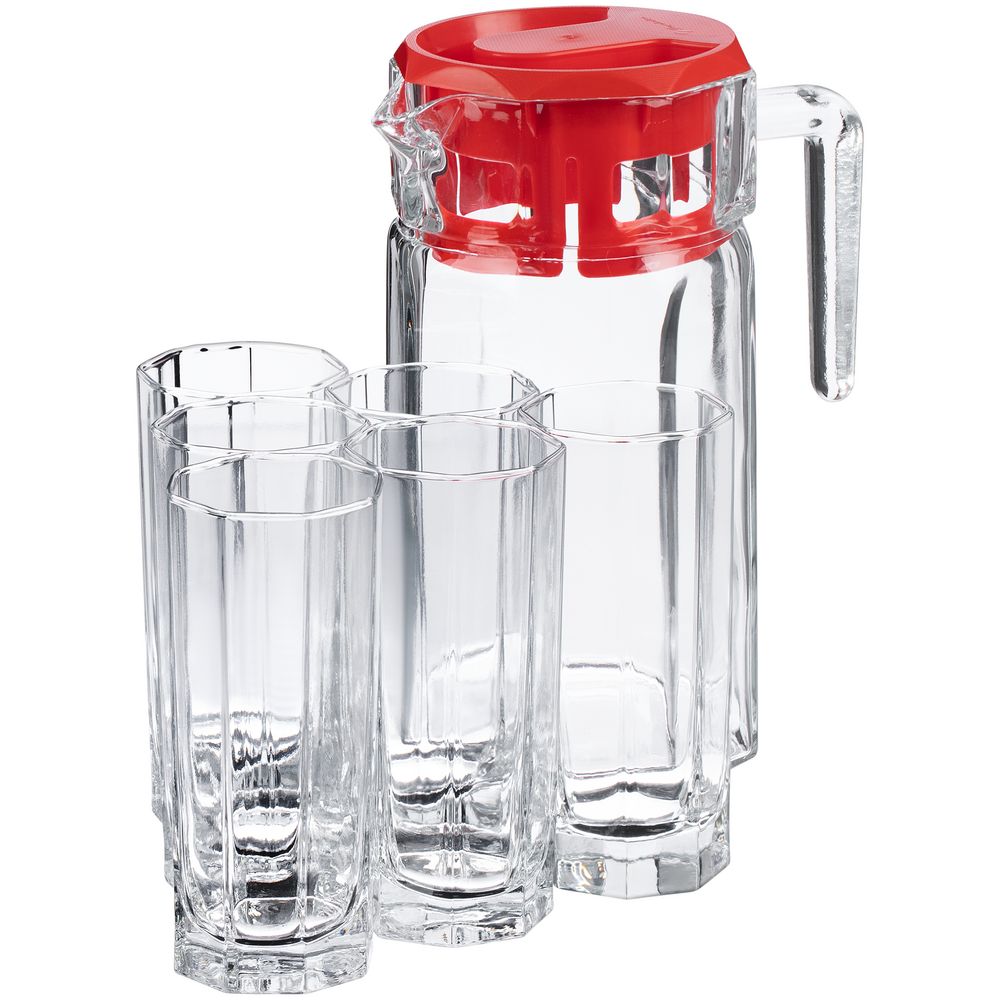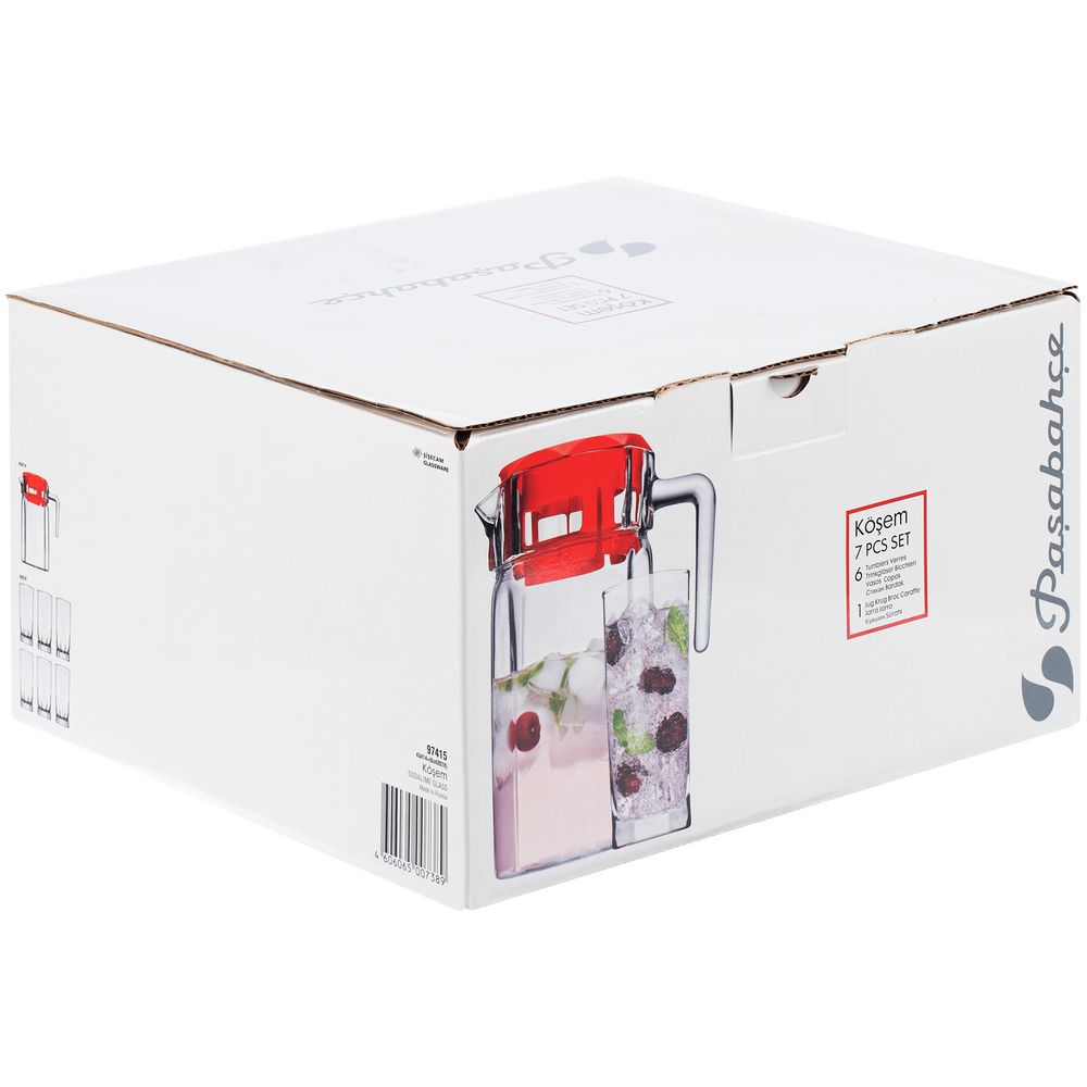 Набор Kosem из 6 стаканов и графина из прочного натрий-кальций-силикатного стекла. Рельефная многогранная поверхность стаканов идеально подходит для воды, сока и других напитков. Графин оснащен удобной пластиковой крышкой, которая плотно закрывается, — напиток не прольется случайно на стол.В наборе кувшин и 6 стаканов.