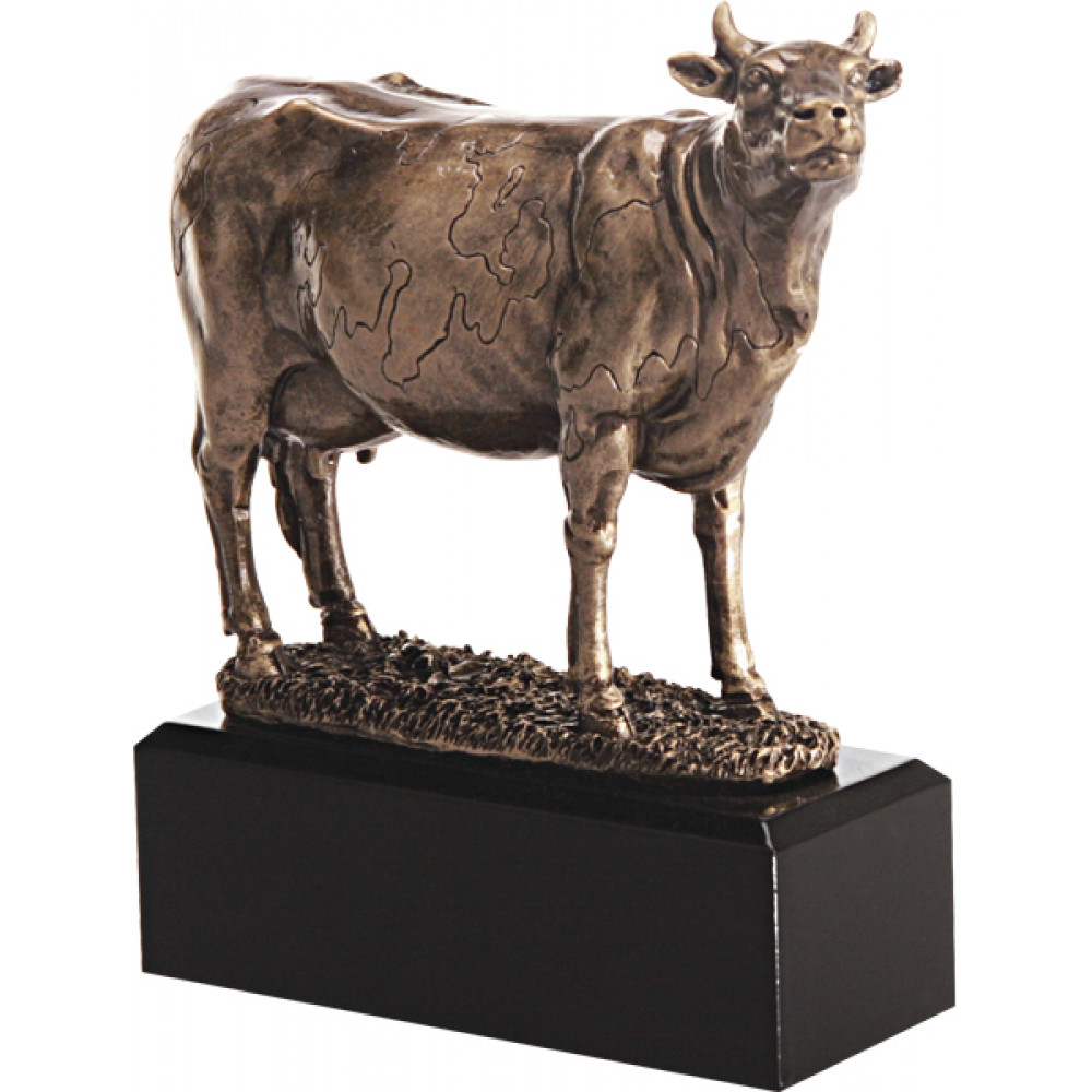 Фигурка литая "Корова". Цвет бронза. Изображена корова, стоящая на траве. На теле коровы видны пятна в виде вдавленных линий. Фигура установлена на черной подставке в форме квадрата.