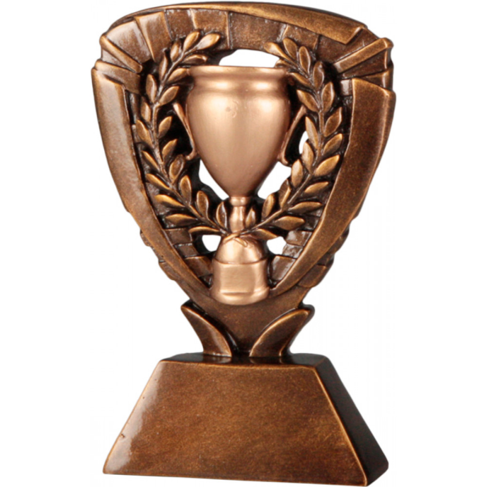 Фигурка литая "Трофей". Материал пластик, цвет бронза. Высота 13 см.¶Фигурка представляет собой треугольник с широким кантом, на котором расположены четырехугольные выпуклые фигуры по периметру. В центре треугольника расположен кубок, который с правой и левой стороны огибают лавровые ветви. Фигура имеет основание в форме трапеции. Место под эмблему размером 40*25 мм.