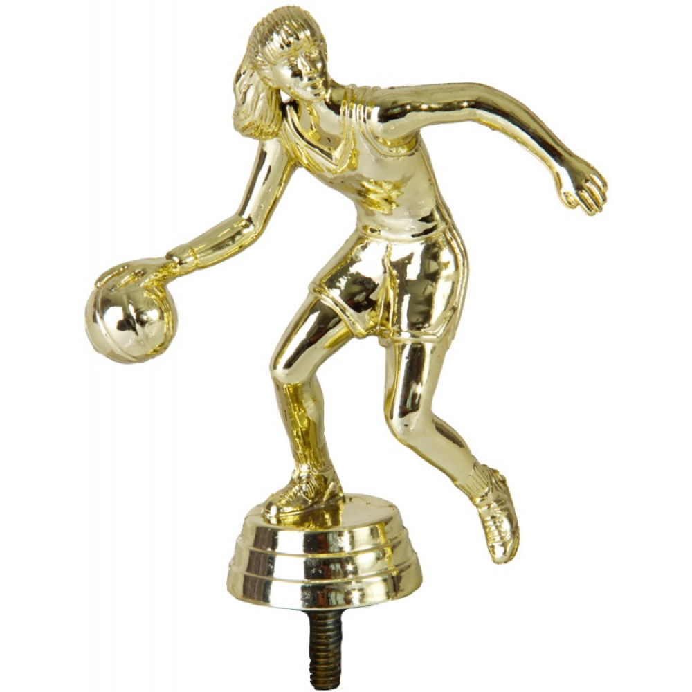 Цвет: золото, материал: пластик. Вид спорта: баскетбол. Фигурка выполнена в виде женщины-баскетболистки. Её волосы собраны в хвост и перекинуты через плечо. Правой рукой она ведёт мяч, левая рука вытянута в сторону. Голова спортсменки повернута в сторону, она неотрывно смотрит на цель. Её левая нога зависла в воздухе. Правая прижата к земле. Кажется, что баскетболистка сейчас прыгнет и забросит мяч в кольцо. На спортсменке надета майка и длинные шорты. Ниже - круглое основание, на котором имеются горизонтальные линии. Высота, см: 12.1 Вес, кг: 0.046. Фигурку возможно закрепить на цоколь, постамент или кубок.