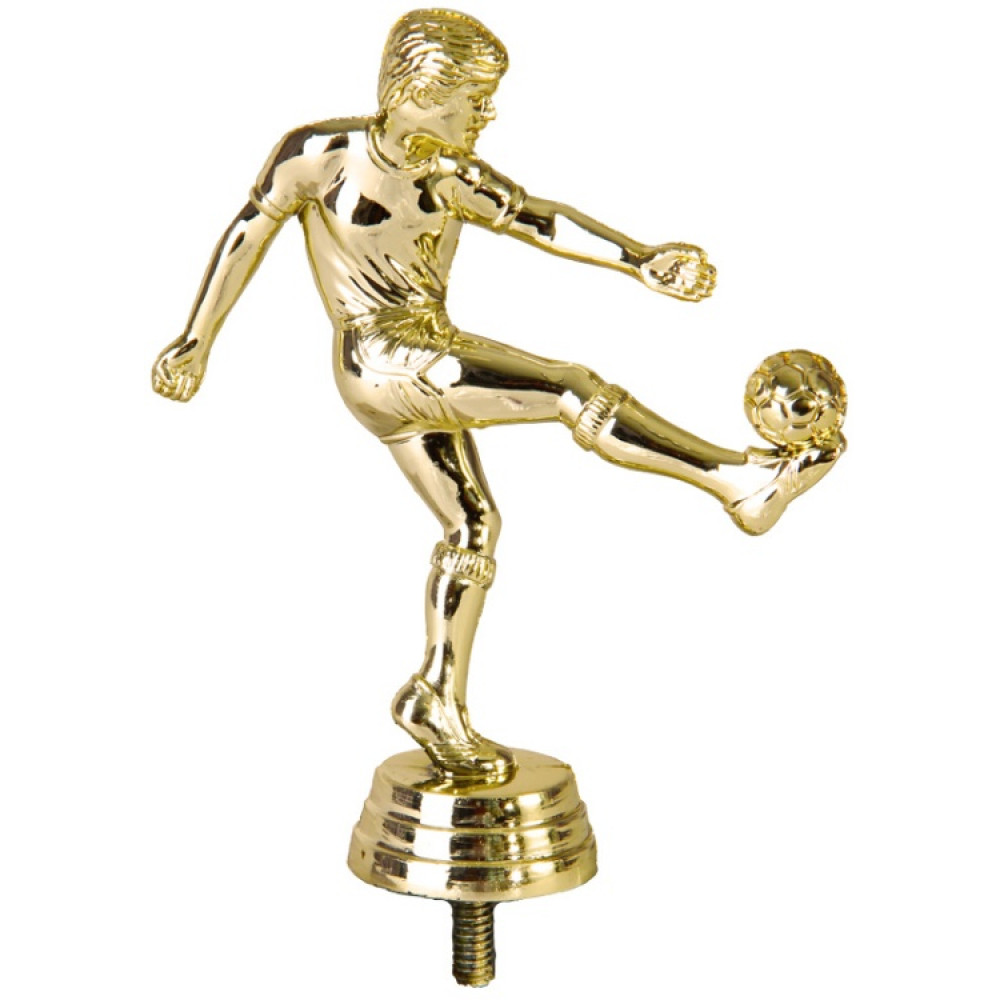 Цвет: золото, материал: пластик. Вид спорта: футбол. Фигурка выполнена в виде футболиста, играющего с мячом. Его левая нога согнута в колени, правая вытянута вперед, на ней расположен мяч. Футболист согнулся в торсе, от чего на футболке появились складки, шорты немного приподнялись вверх из-за движения. Игрок сконцентрировано смотрит на свою цель, не отводя взгляда. Высота, см: 12.7. Фигурку можно закрепить на цоколь, постамент или кубок.