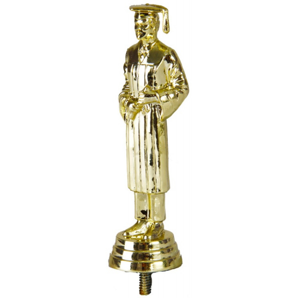 Цвет: золото, материал: пластик. Тема: образование. Фигурка выполнена в виде мужчины, одетого в мантию и колпак для выпускников университета. Ноги стоят вместе. Из под мантии видны штаны. На ногах классические туфли. Мужчина находится на круглом основание, на котором имеются горизонтальные линии. Высота, см: 12.7. Фигурку можно закрепить на цоколь, постамент или кубок.