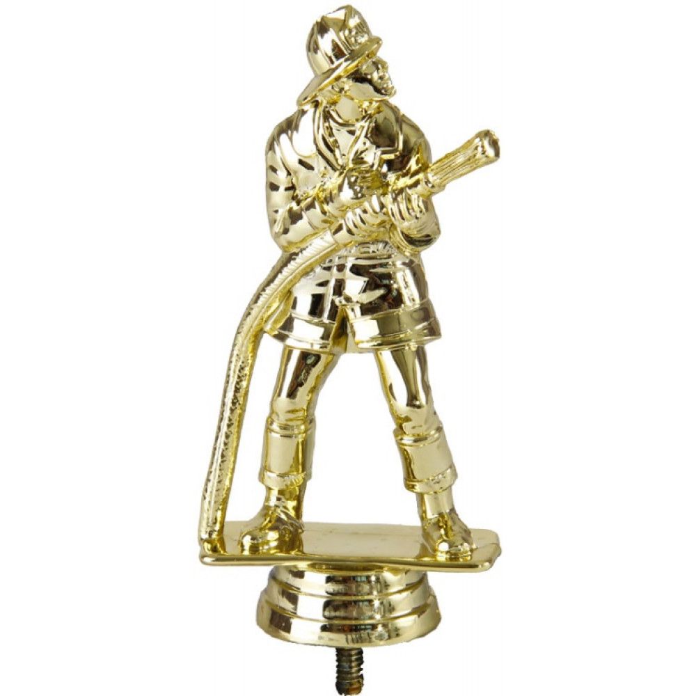 Цвет: золото, материал: пластик. Вид спорта: пожарный. Фигурка выполнена в виде фигуры мужчины-пожарного. Он одет в комплект боевой одежды пожарного, включая каску. Его голова повернута вправо на цель. В руках пожарный держит длинный шланг. Ноги расставлены на ширине плеч. Пожарный находится на тонкой пластине – имитации пола. Ниже - круглое основание, на котором имеются горизонтальные линии. Высота, см: 13.3 Вес, кг: 0.052. Фигурку возможно закрепить на цоколь, постамент или кубок.