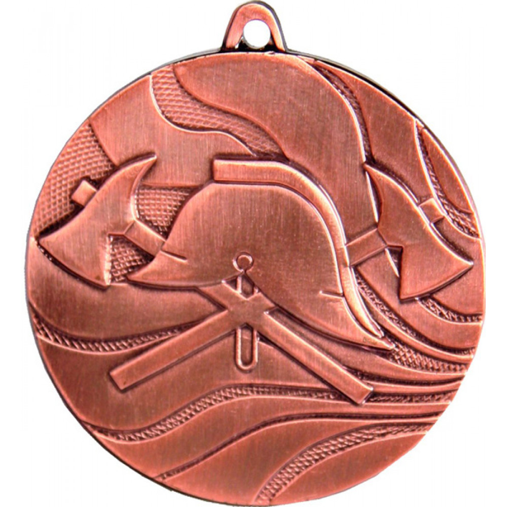 Медаль круглая металлическая. Диаметр 50 мм, толщина 3 мм.¶Цвет медали, имитирующий золото/серебро/бронзу.¶Сверху расположено круглое ушко для крепления ленты. ¶На аверсе медали нет места под вставку. ¶По центру аверса медали изображены перекрещенные пожарные топоры, посередине-пожарная каска. ¶Фон медали из мелких ромбов, почти сливающихся в выпуклые точки. Поверх данного узора расположены толстые линии (8 штук) в виде извивающихся на ветру лент, которые отходят от правой стороны в левую.¶На медали нет никаких других изображений и рисунков.
