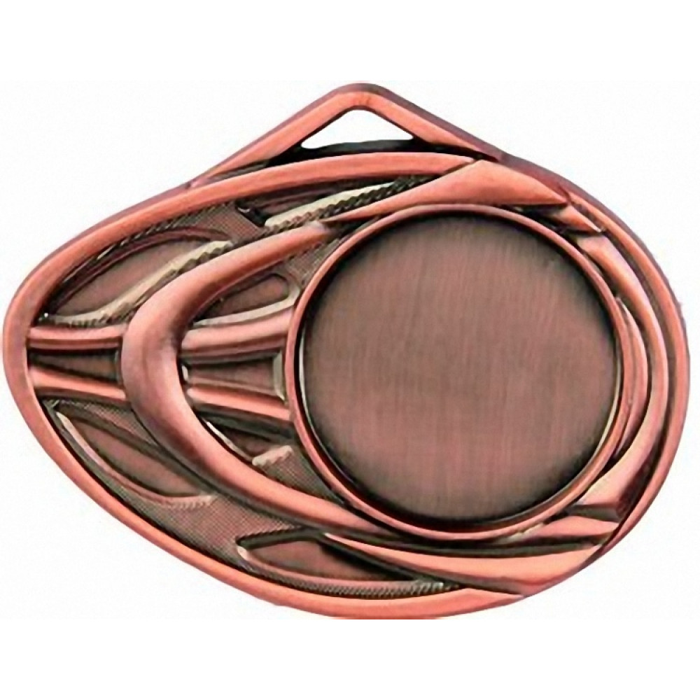 Медаль металлическая. Диаметр 50 мм, толщина 3 мм.¶Цвет медали, имитирующий золото/серебро/бронзу.¶Сверху расположено треугольное ушко для крепления ленты. ¶На аверсе медали в центральной правой части расположено место под вкладку, диаметр 25 мм, имеет кант.¶Медаль в форме яйца, расположенного горизонтально. Имеет кант. На медали изображены толстые выпуклые линии в хаотичном порядке. Одна полоса в форме дуги огибает место под вкладку.¶На медали нет никаких других изображений, нет рисунков, относящихся к конкретному виду спорта.