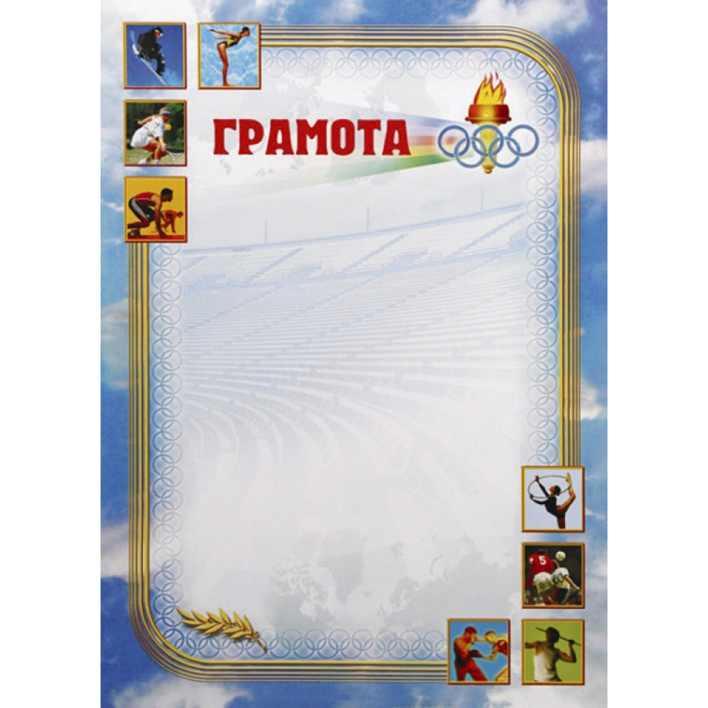 Грамота, формат А4. Бумага матовая, толщина 200 гр, полноцветная печать.¶Грамота голубого цвета. На грамоте изображено небо с облаками, в 1 см от края проходят полосы желтого цвета, образуя прямоугольную фигуру, внутри которой изображены полупрозрачным цветом трибуны стадиона. Верхний правый угол и левый нижний угол сглажены, в левом верхнем углу и правом нижнем углу расположены по 4 квадрата с изображениями спортсменов по разным видам спорта. Внутренняя окантовка фигуры в виде олимпийских повторяющихся колец. В нижней части расположена лавровая веточка, в верхней части расположено слово "Грамота" красным цветом, справа от него олимпийский факел с кольцами, от которого в сторону слова "Грамота" отходят лучи радужного окраса.