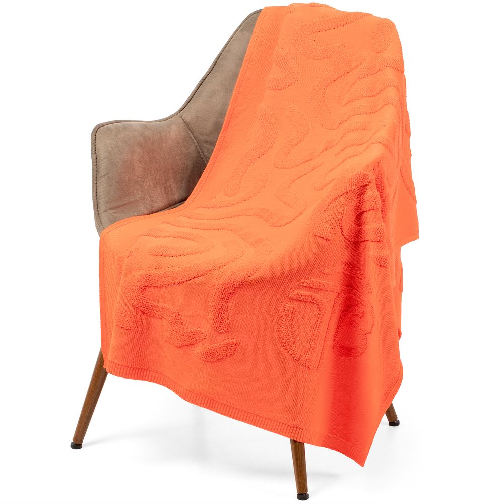 Модель: однотонный плед с фактурной вязкой, которая позволяет сделать его воздушным и объемным. Чередуя различные типы петель на гладком полотне, можно вывязать любую графику — логотип, текст, товарный знак.