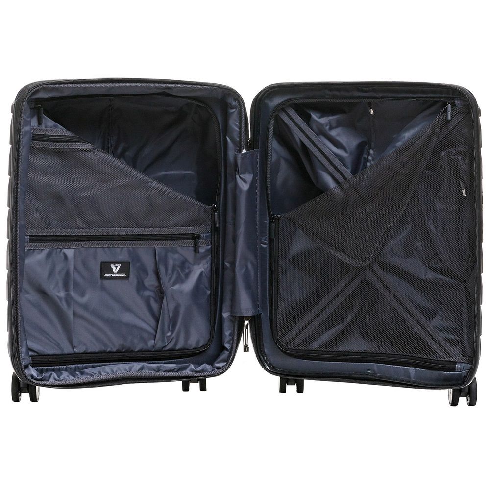 • Чемодан с 2 отделениями: одно из них с фиксирующими ремнями и сетчатой шторкой на молнии, второе — с разделителем на молнии