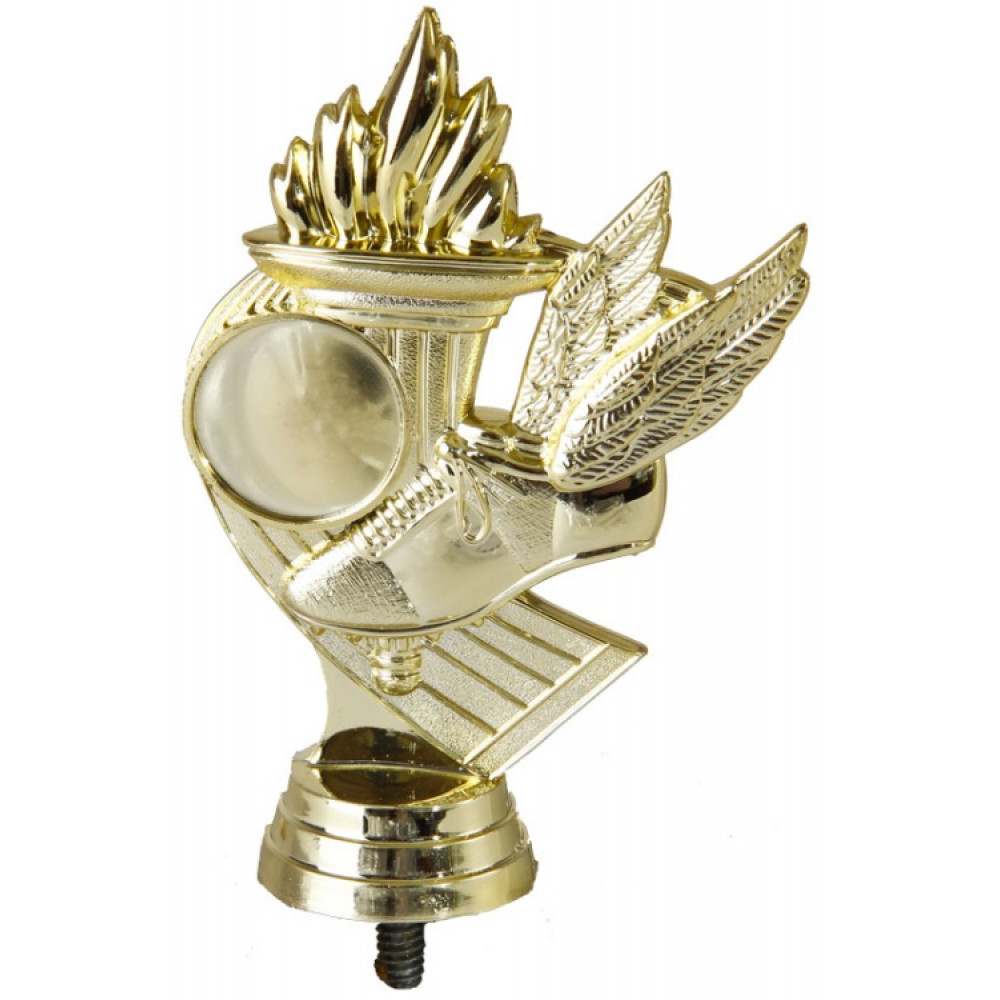 Цвет: золото, материал: пластик. Вид спорта: бег. Фигурка выполнена в виде дорожки для бега, плавно загнутой в сторону. Дорожка украшена вертикальными линиями. В начале дорожку пересекает большой кроссовок с шипами, украшенный крыльями, что олицетворяет быстроту спортсменов, занимающихся данным видом спорта. Выше имеется место для нанесения персонализации, обрамлённое узким обручем. Завершает фигурку пламенеющий огонь в подставке. Фигурка выполнена в золотом цвете, что придаёт ей роскоши и уникальности. Ниже - круглое основание, на котором имеются горизонтальные линии. Высота, см: 11.4 Вес, кг: 0.041. Фигурку возможно закрепить на цоколь, постамент или кубок.