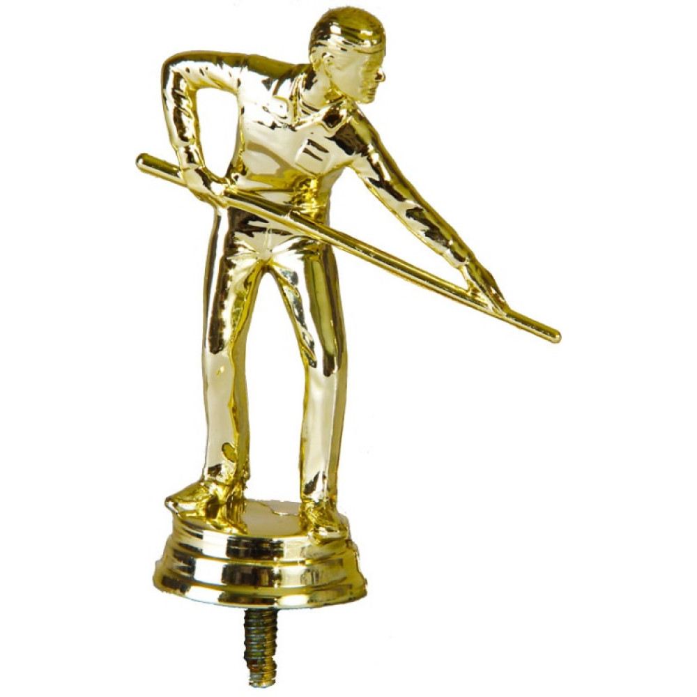 Цвет: золото, материал: пластик. Вид спорта: бильярд. Фигурка выполнена в виде мужчины, готовящегося к удару по бильярдному шару. Его правая рука согнута, левая вытянута. Пальцы зажаты на бильярдном кие. Мужчина одет в удобную рубашку с треугольным вырезом и штаны. Высота, см: 10.5 Вес, кг: 0.029. Фигурку можно закрепить на цоколь, постамент или кубок.