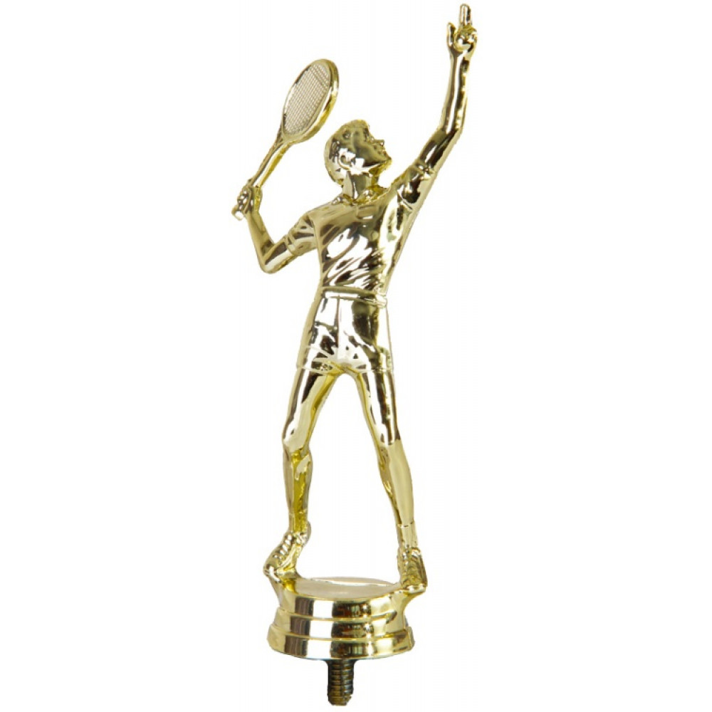 Цвет: золото, материал: пластик. Вид спорта: большой теннис. Фигурка выполнена в виде мужчины- теннисиста. Его взгляд направлен вверх на руку, в одной его руке зажата ракетка, другая - поднята вверх. Теннисист одет в футболку и шорты. Мужчина вытянулся и прогнулся в спине, от чего на футболке появились складки, шорты немного приподнялись вверх из-за движения. На ногах- кроссовки. Высота, см: 14. Фигурку можно закрепить на цоколь, постамент или кубок.