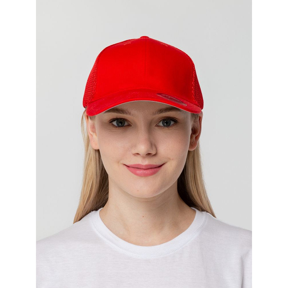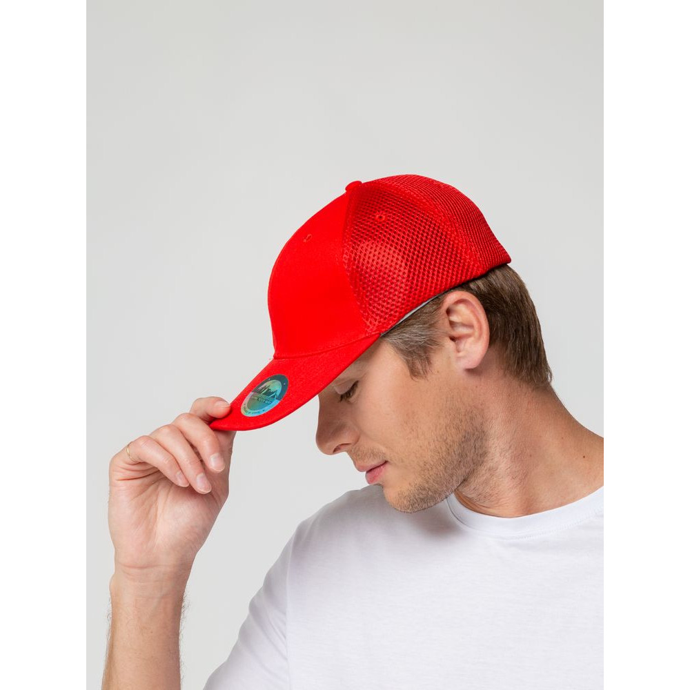 - Однотонная бейсболка из двух видов ткани: козырек и лобовые клинья из гладкого полотна, клинья на боках и на тыльной стороне из спортивной сетки