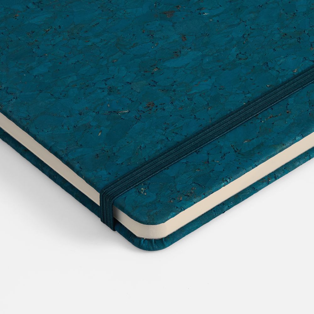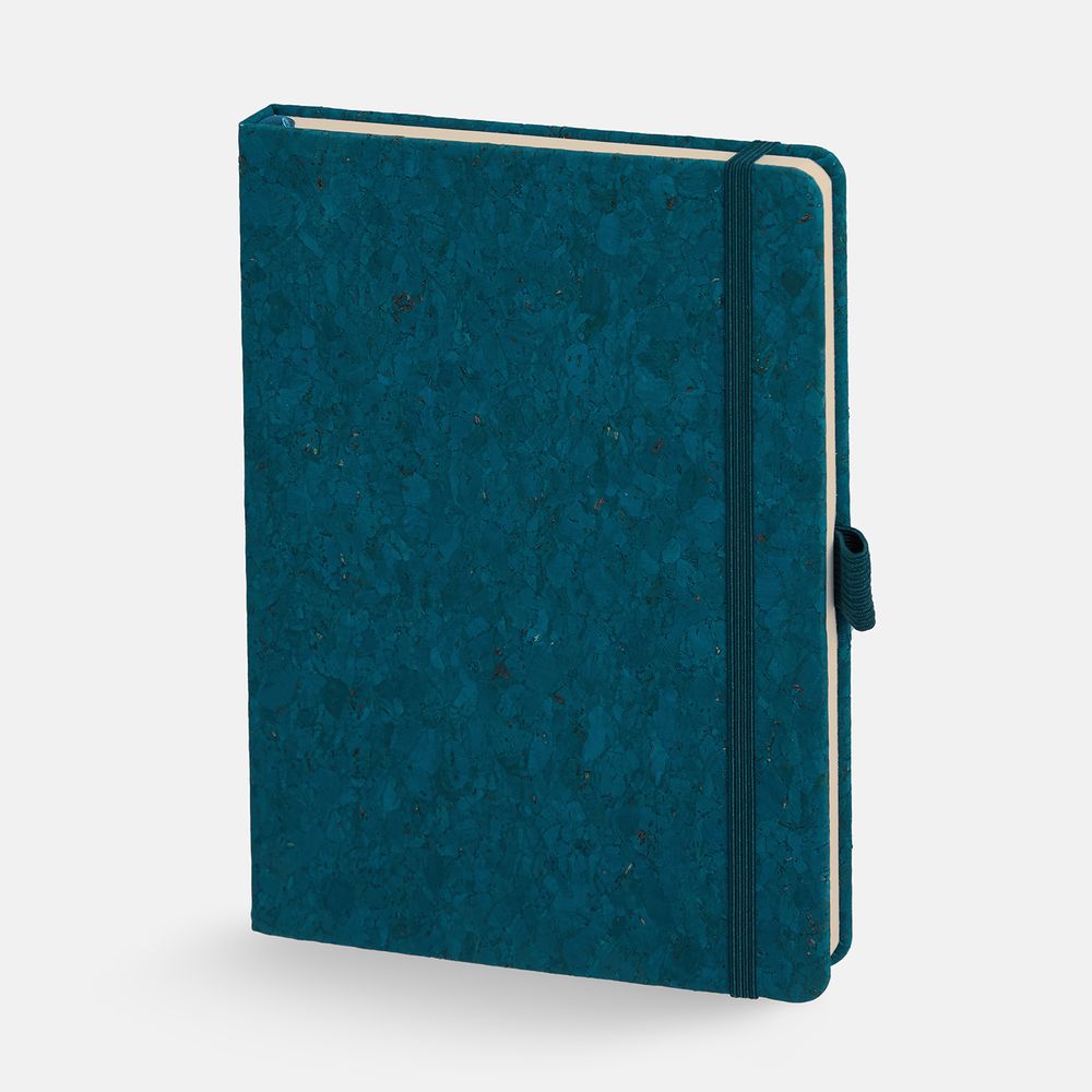 Блокнот с твердой обложкой из натуральной окрашенной пробки, дополнен петлей-резинкой для ручки, ляссе и резинкой в цвет обложки.