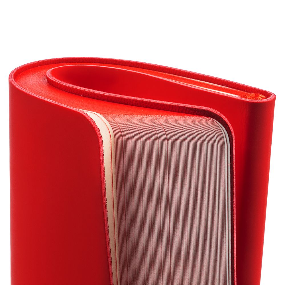 Ежедневник с гибкой обложкой, выполнен из материалов Soft Touch Ultra, красный РР, и Latte, красный (внутренняя часть обложки), дополнен ляссе в цвет обложки с металлическим шильдиком.