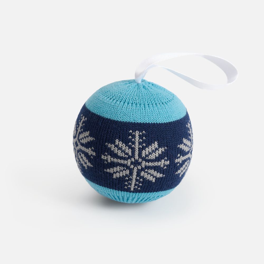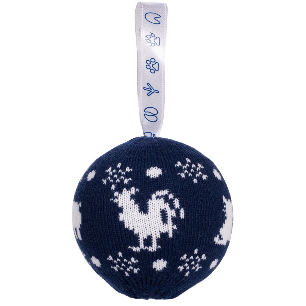 Елочный шар с вывязанным логотипом и индивидуальным рисунком в фирменной цветовой гамме.