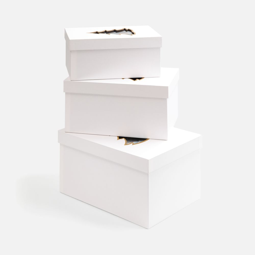 Коробка из переплетного картона, кашированного белой дизайнерской бумагой.