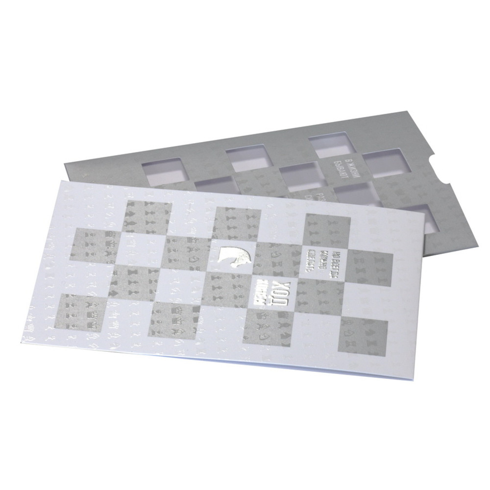 Открытка изготовлена из дизайнерского картона представительского класса с необычными элементами объемного тиснения и покрыта УФ-лаком, который создает шахматный узор. Возможно нанесение методом цифрового офсета.