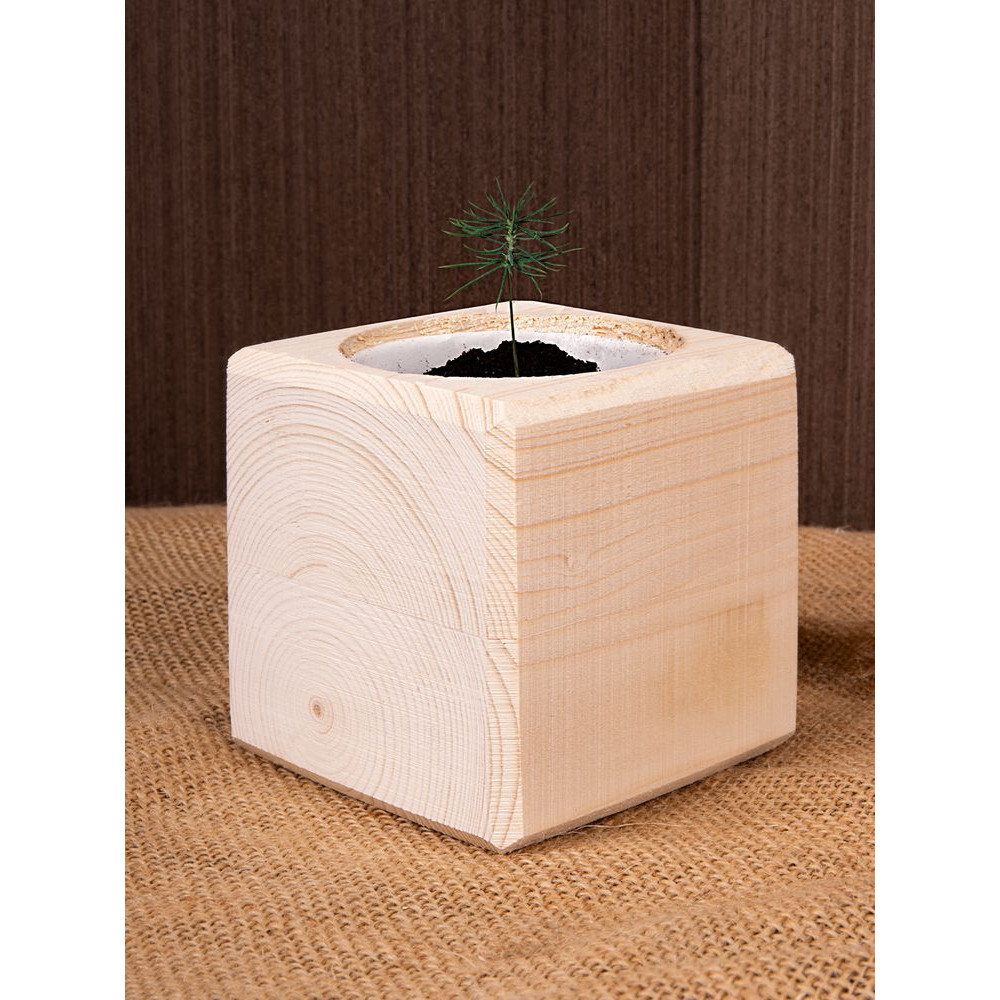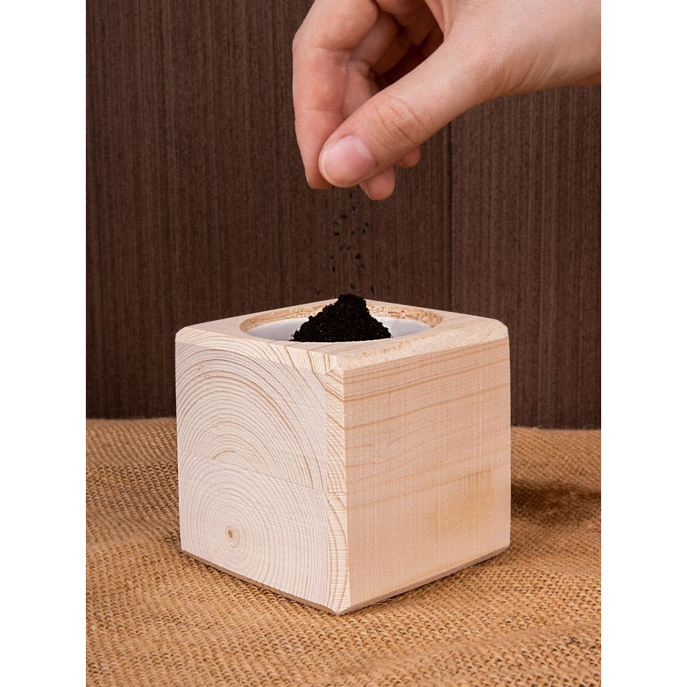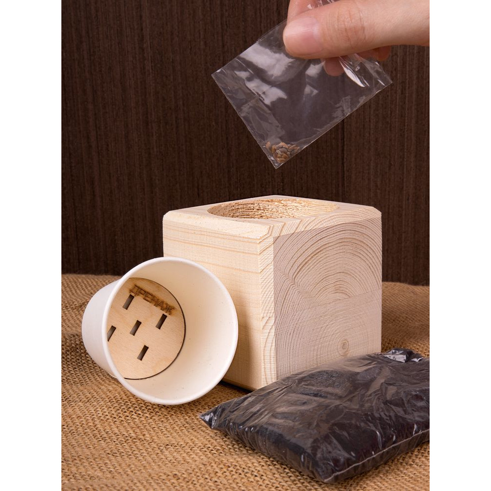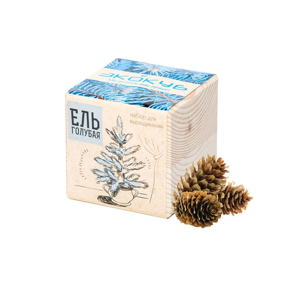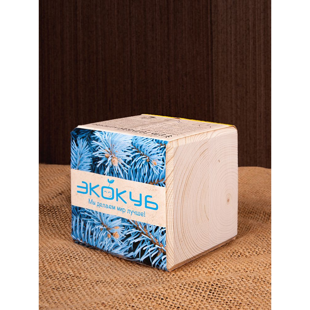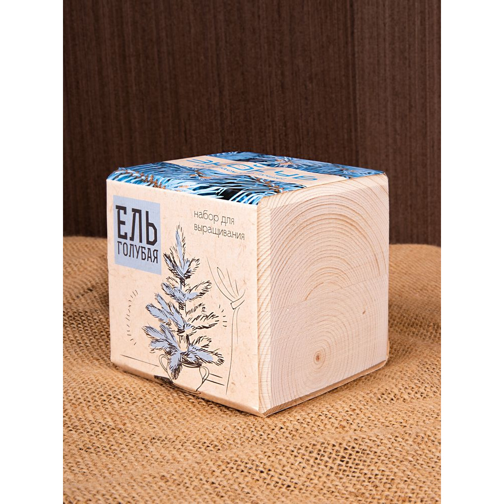 В наборе: деревянный куб, грунт, семена голубой ели.