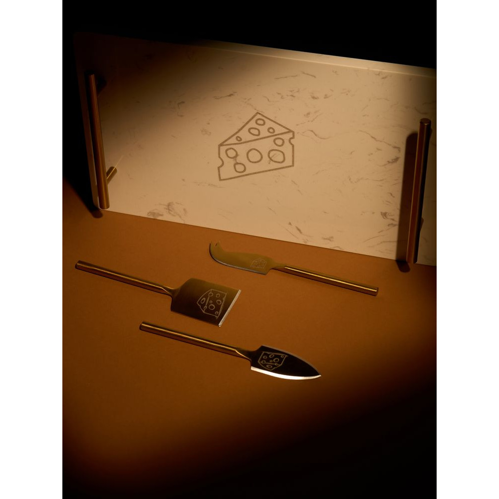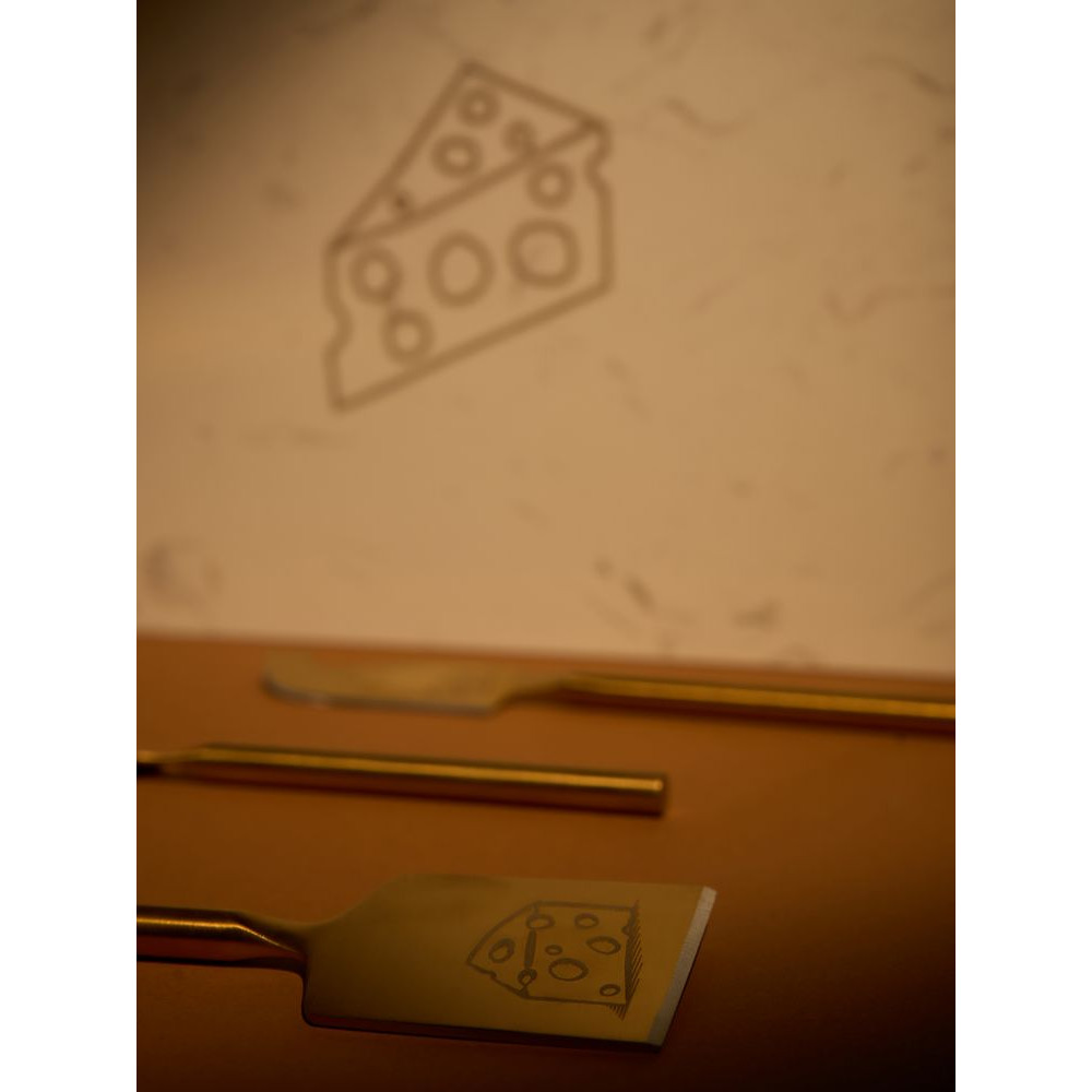 Золотистый цвет ручек и трех ножей подчеркивает статус всего набора и возвышенность самой сырной дегустации. При нарезке мягких сортов сыра особенно важно сохранить эстетичный вид ломтиков, поэтому здесь не обойтись без специальных ножей. Нож-лопатка удобен как для нарезки, так и для сервировки мягких и полутвердых сортов, а еще им можно красиво раскрошить твердый сыр. А нож с раздвоенным кончиком можно также использовать в качестве элегантной вилки. Листовидный нож для твердых сортов — это проверенная классика, которой можно доверить пармезан.