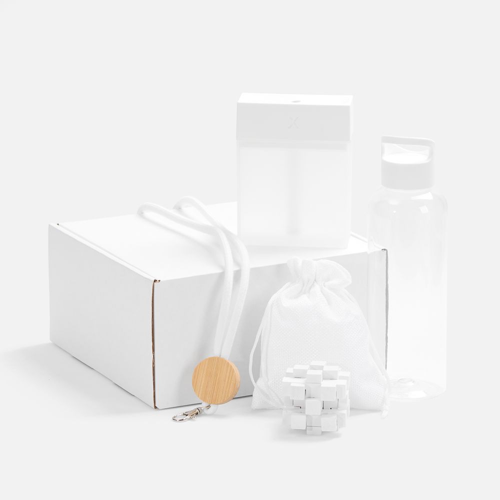Набор собран с заботой: помимо надежного шнурка для бейджа — для быстрой идентификации на новом месте, здесь есть полезные аксессуары для гидратации как внешней, так и внутренней: компактный увлажнитель воздуха и стильная бутылка для воды. А дополняет эти функциональные предметы игра-головоломка, которая поможет и развить пространственное мышление, и переключить внимание — а в первые рабочие дни разгружать голову просто необходимо!