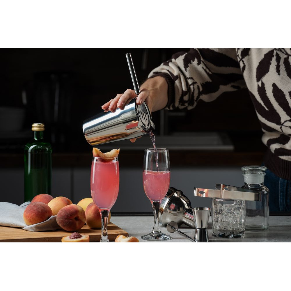 Отмерить нужное количество ингредиентов для напитка поможет мерный стаканчик — джиггер, барной ложкой удобно насыпать специи, а обратной ее стороной — разминать сочные кусочки фруктов. Щипцы пригодятся для добавления в шейкер кусочков льда или сахара, а ситечко-стрейнер поможет отделить коктейль от льда и мякоти фруктов, когда понадобится перелить уже готовый напиток из шейкера в стакан.В наборе: