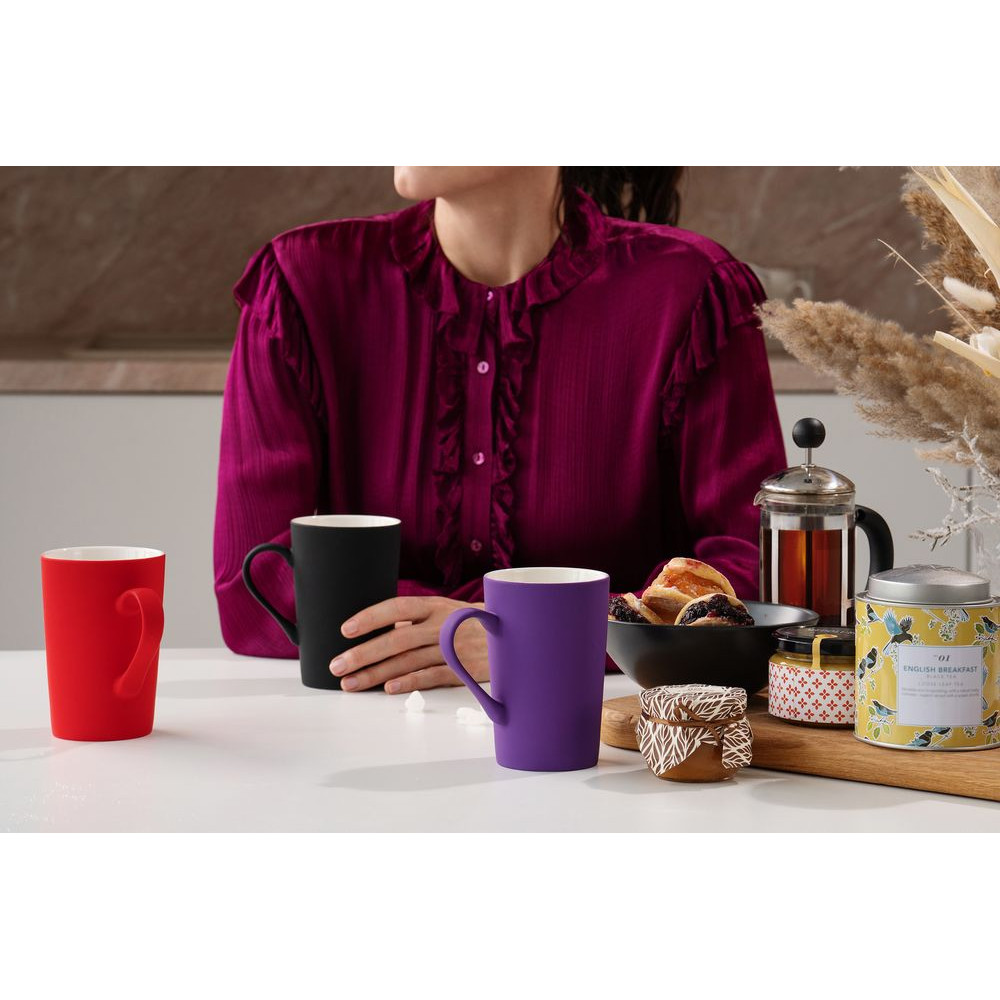 Благодаря бархатной поверхности soft-touch кружку не хочется выпускать из рук ни на секунду. Она точно не будет пылиться на полке в шкафу. Необычная форма и яркий цвет помогут освежить дизайн любой кухни.