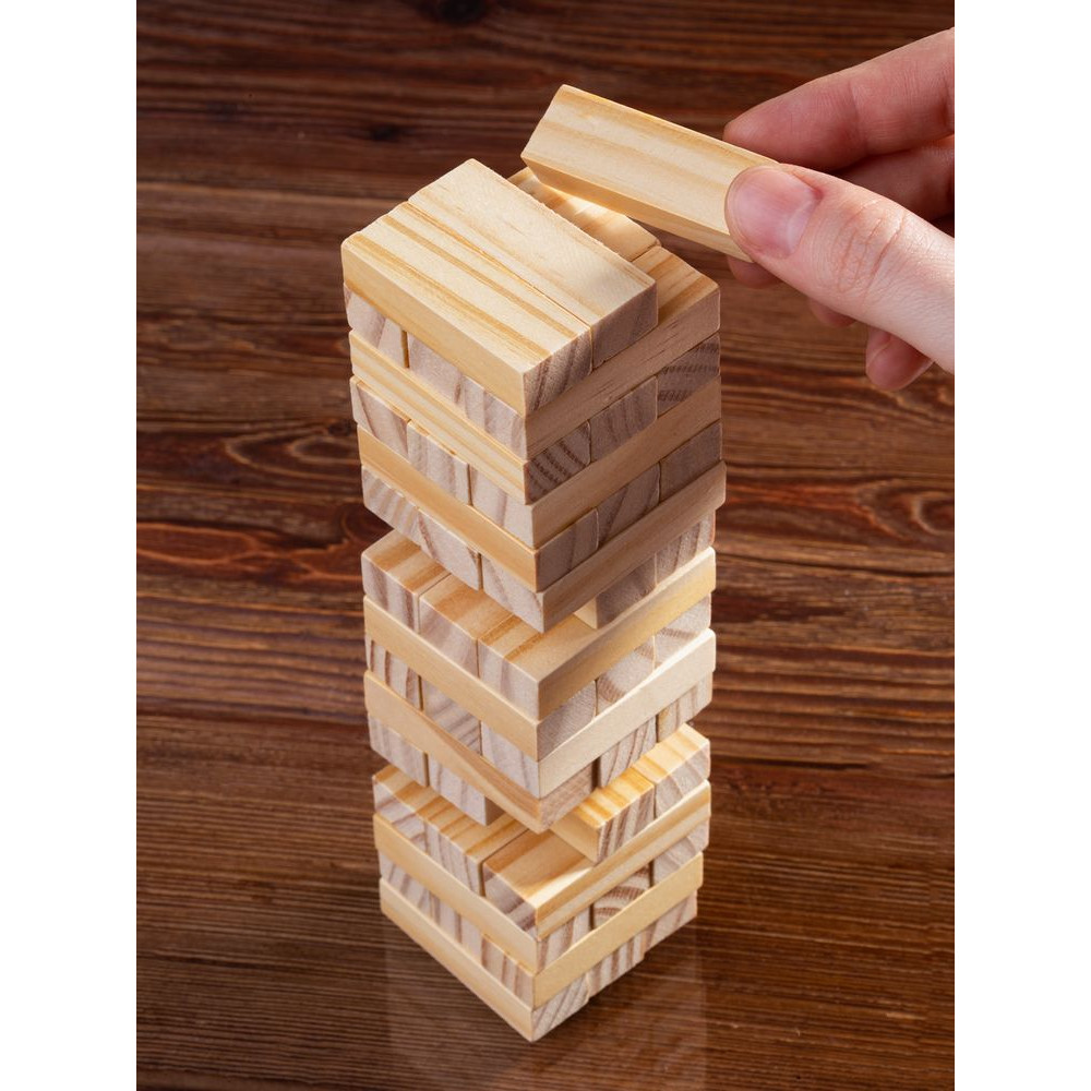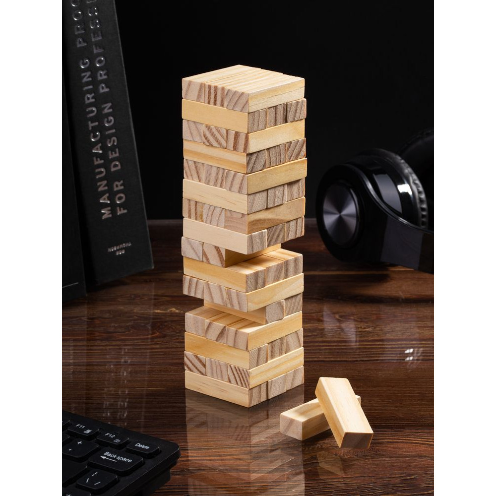 Второе название игры — «Падающая башня». Сначала строится башня: по три брусочка в ряд, каждый слой перпендикулярен предыдущему. Затем игроки по очереди вытаскивают по одному брусочку и кладут его на верх сооружения. Тот игрок, кто обрушит башню, проиграл. Игра тренирует ловкость, внимание, терпение и пространственное мышление, что очень важно и в бизнесе. Так что подарок не только развлечет, но и может стать символом-пожеланием.