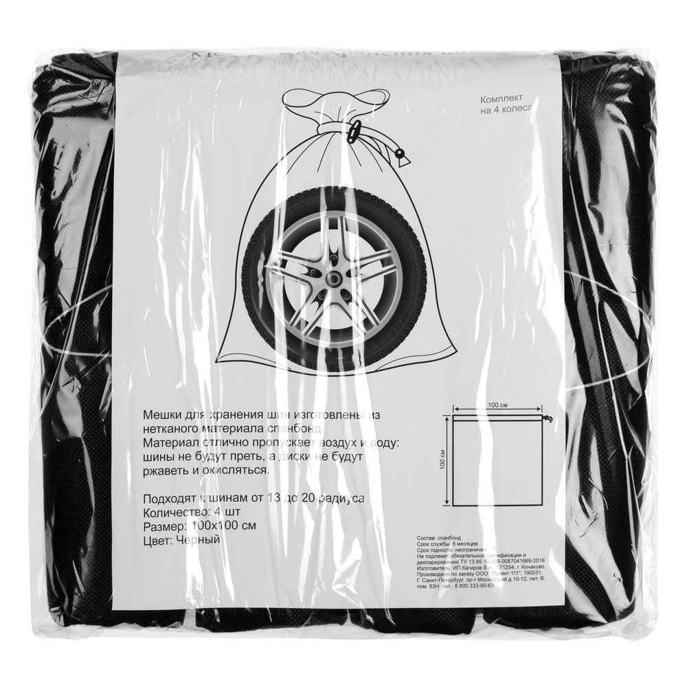 Мешки изготовлены из спанбонда — прочного, устойчивого к истиранию нетканого материала, который отлично пропускает влагу и воздух. Благодаря этому шины не будут запотевать, а диски — окисляться или ржаветь.