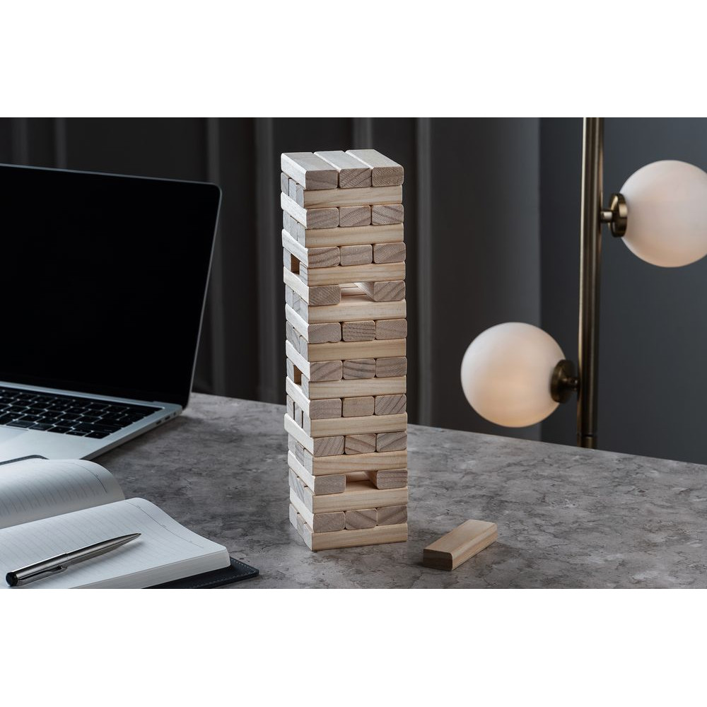 Второе название игры — «Падающая башня». Сначала строится башня: по три брусочка в ряд, каждый слой перпендикулярен предыдущему. Затем игроки по очереди вытаскивают по одному брусочку и кладут его на верх сооружения. Тот игрок, кто обрушит башню, проиграл. Игра тренирует ловкость, внимание, терпение и пространственное мышление, что очень важно и в бизнесе. Так что подарок не только развлечет, но и может стать символом-пожеланием.