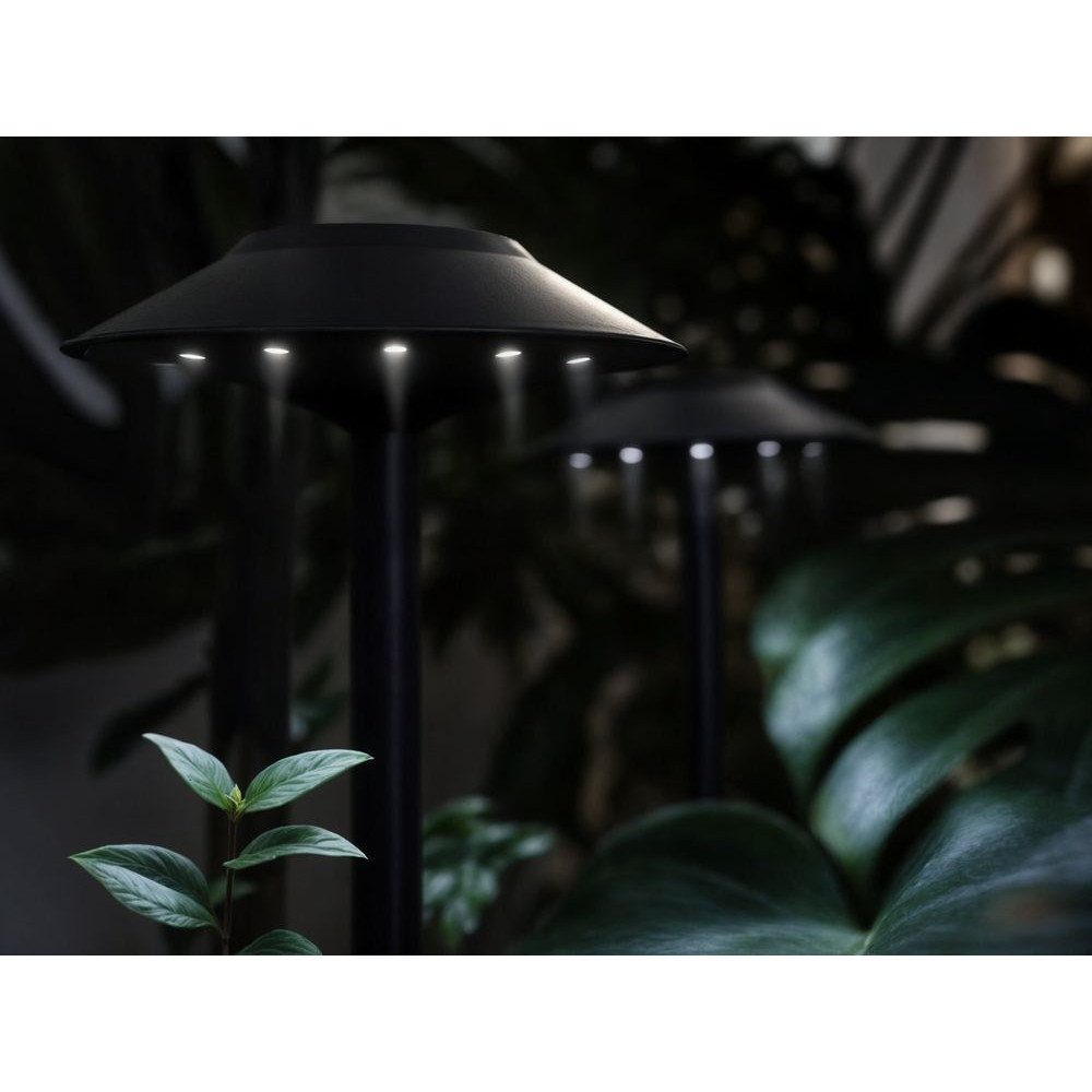 Светильник Ufology в лаконичном корпусе прекрасно подходит для освещения садовых дорожек, тропинок и декоративных элементов на газоне. Благодаря оригинальной конструкции плафона — в форме зонтика — глазам всегда будет комфортно в темноте — без яркого, бьющего света.