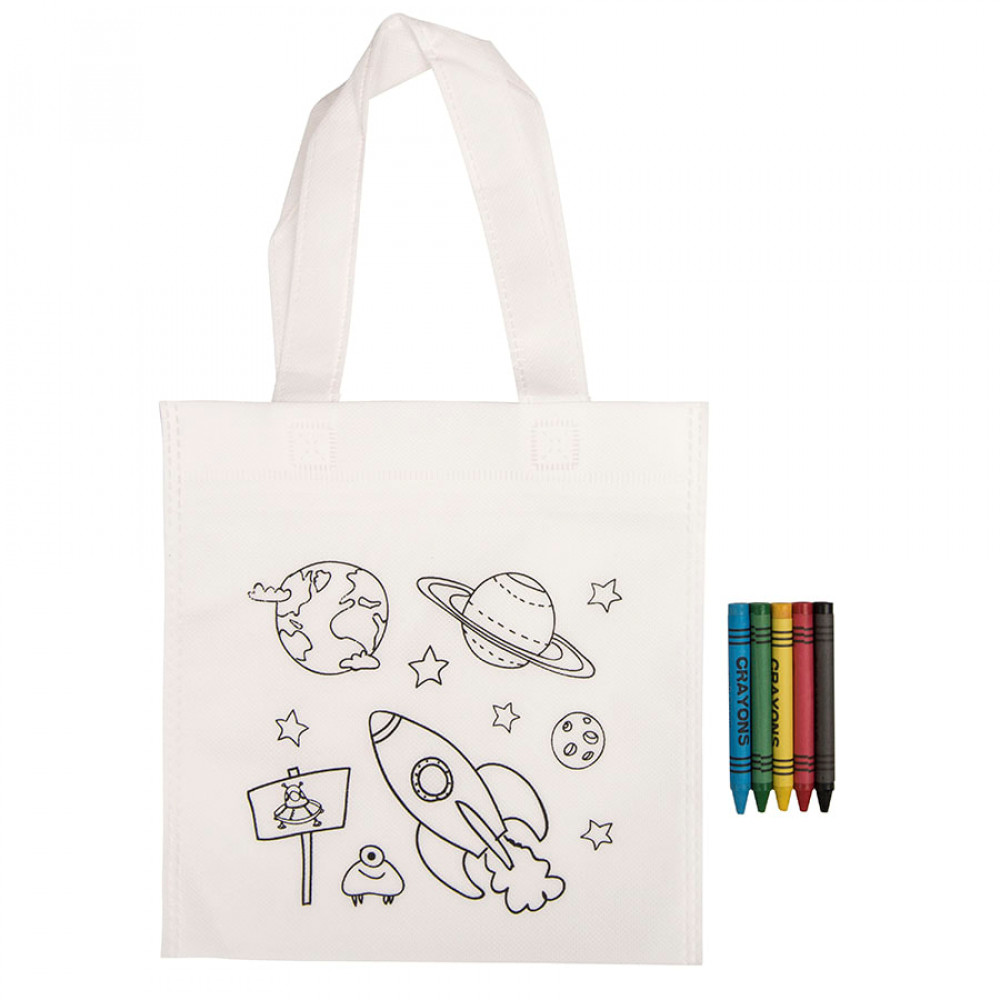 Сумка из нетканого материала белого цвета, специально разработанный для раскрашивания мелками. В набор входят 5 цветных мелков: синий, красный, желтый, зеленый, черный.