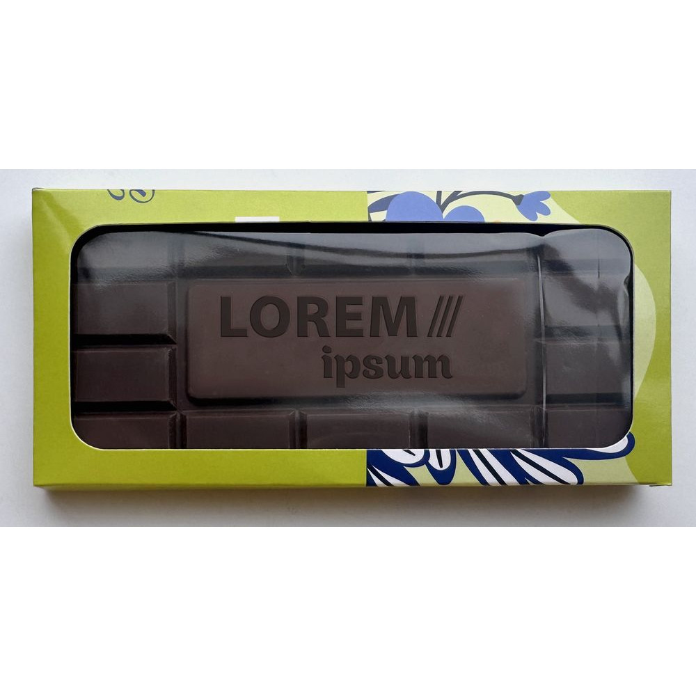 Шоколад упакован в подарочную коробку и индивидуальный флоу-пак. Ламинация коробки: матовая или глянцевая.Шоколад изготовлен из сырья бельгийской компании Barry Callebaut.