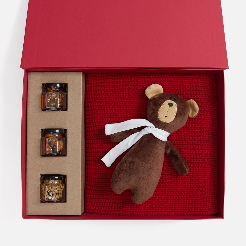 Милый мишка в шарфике с целой коллекцией разнообразного ароматного меда идеально дополняет основной, более практичный подарок — объемный шарф из толстой пряжи, который впишется в любой зимний образ.