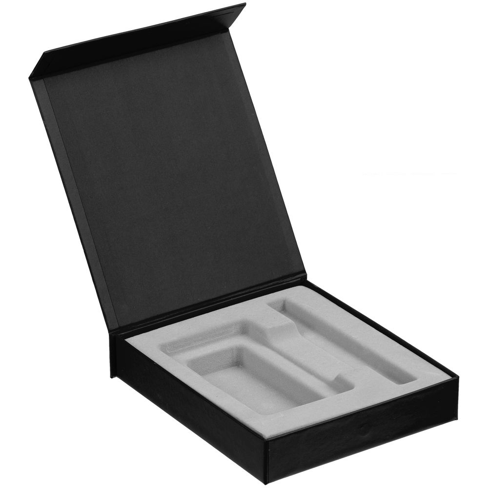 Подарочная коробка для аккумулятора 12,3х7,1х1 см и ручки 14,5х1,5х0,8 см с крышкой на магните и флокированным ложементом.